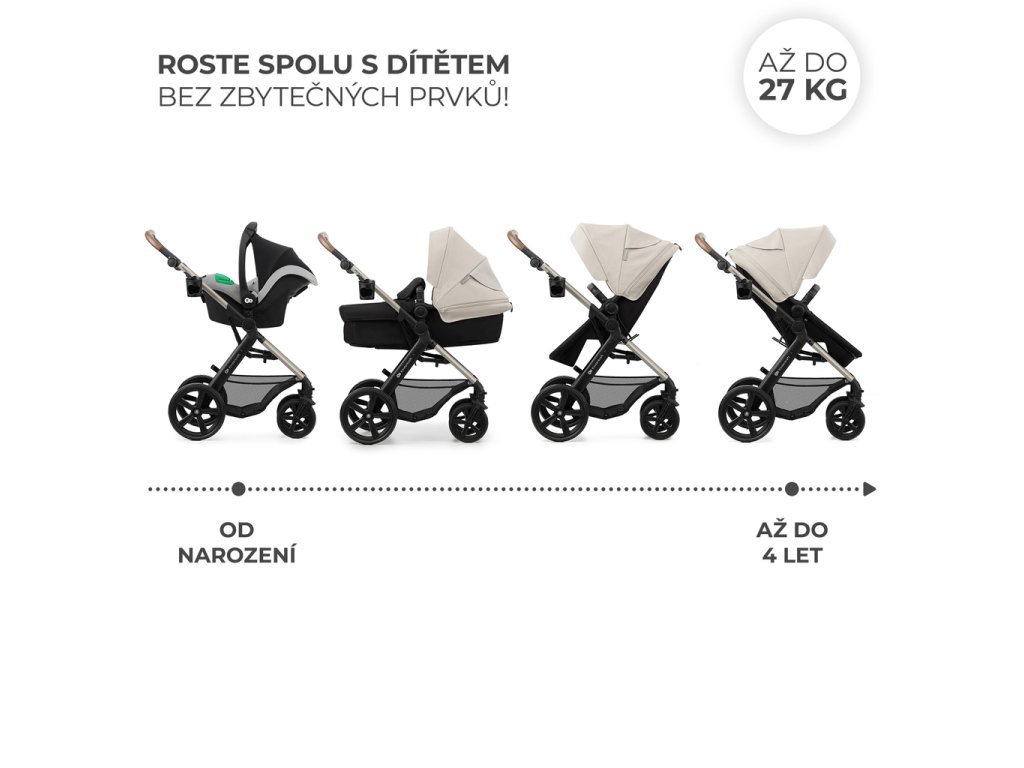 - Kočárek od narození do 27 kg: nosnost rámu do 22 kg, nosnost koše: 5 kg.