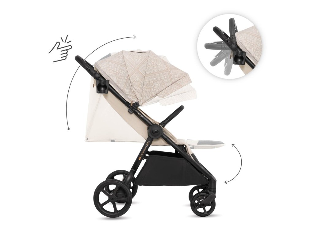 MITZY se skládá do kompaktní velikosti jednou rukou. Systém skládání dovnitř chrání látku sedáku před znečištěním. Kočárek je lehký, takže jej snadno vynesete po schodech, a jeho kompaktní rozměry ve složeném stavu vám umožní uložit kočárek do auta spolu se zavazadly.