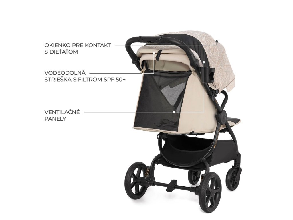 MITZY ochrání Vaše dítě během procházky – velká, nepromokavá stříška má filtr UPF50+, který Vaše děťátko ještě více ochrání před UV zářením. Má větrací panel pro větrání během veder a okénko pro kontakt s dítětem. Vítr, déšť – ani to není pro tento kočárek žádný problém.