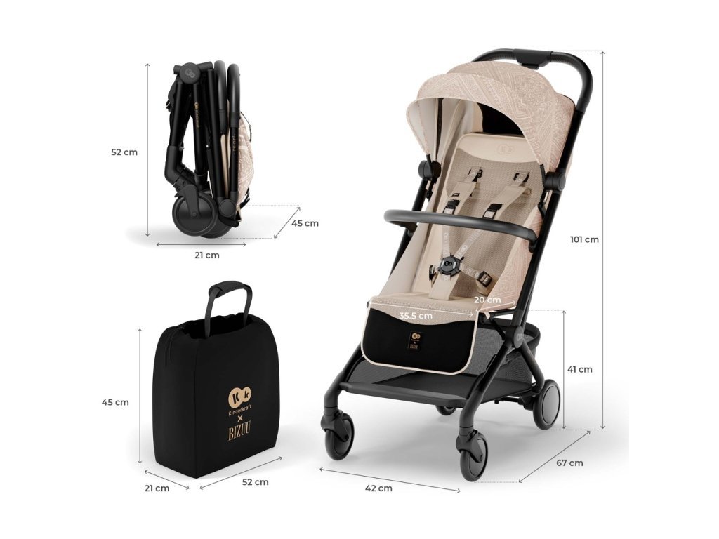 Kočárek je vybaven ochranným krytem, který jej chrání před nečistotami a poškozením při přepravě. Ramenní popruh je natrvalo připevněn ke kočárku a dá se zespodu upevnit, když se nepoužívá, aby nepřekážel při procházce.