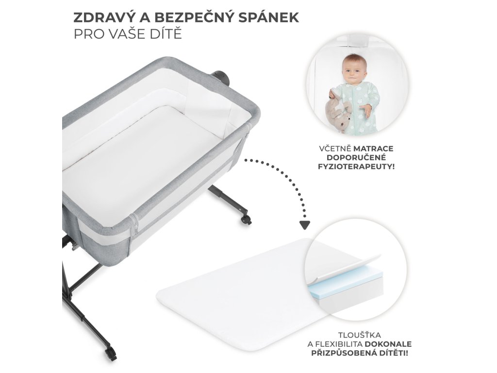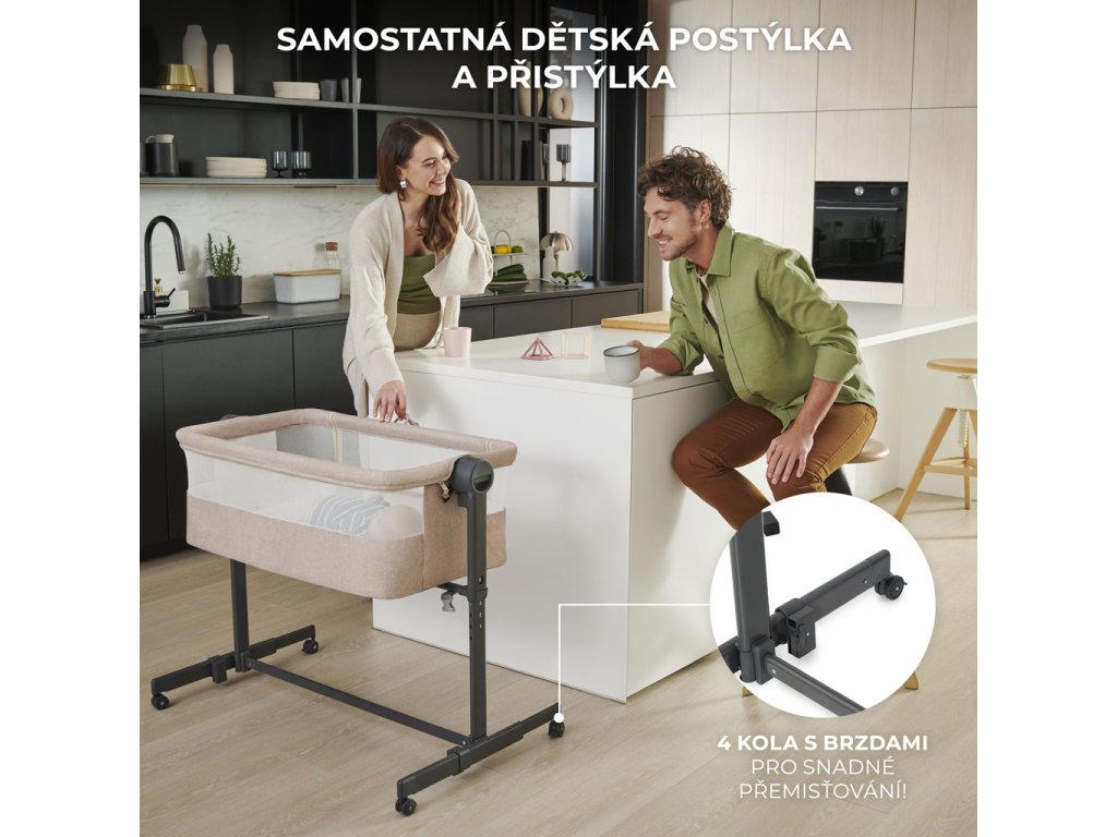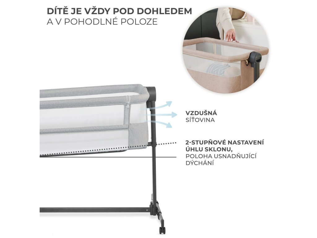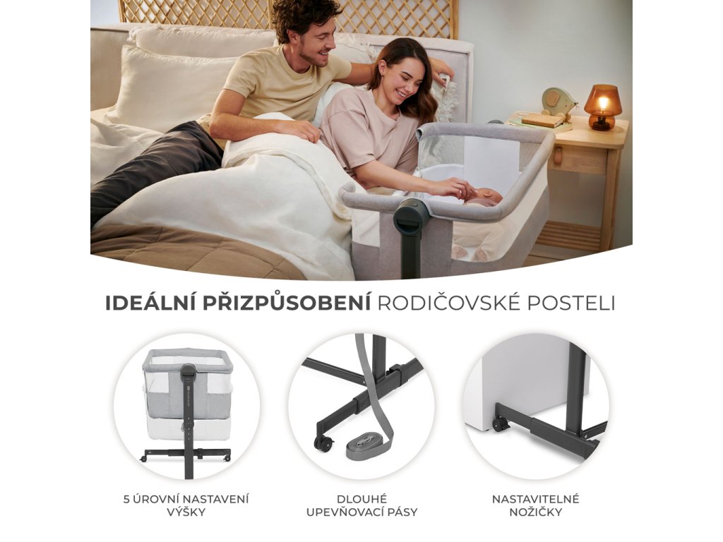 Díky plynulému a snadnému nastavení výšky postýlky lze přistýlku jednoduše přizpůsobit výšce rodičovské postele. Nastavte ji na jednu z 5 úrovní, seřiďte nožičky tak, aby přistýlka těsně přiléhala k posteli, a připevněte ji speciálními popruhy, abyste vytvořili bezpečný prostor pro spaní vašeho dítěte. Zachováte si prostor pro sebe a zajistíte si hygienu spánku, ale zároveň budete mít své dítě na dosah ruky.