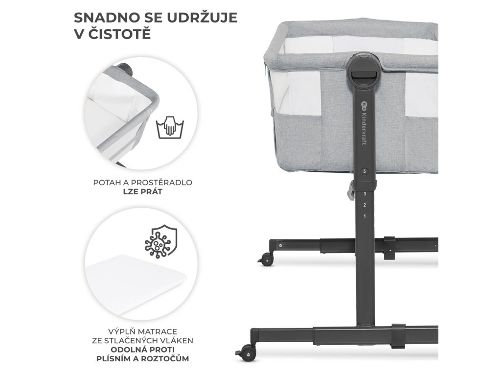 Tato multifunkční postýlka má až 5 výškových úrovní, díky tomu ji můžete snadno přizpůsobit výšce svého lůžka. Umožňuje také nastavení úhlu náklonu matrace do jedné ze dvou úrovní – což je spásná volba pro děti, které často ublinkávají nebo jsou nemocné a mají rýmu. Síťka kolem celé postýlky vám umožní diskrétně sledovat, co vaše dítě v danou chvíli dělá, a díky 4 kolečkům můžete postýlku NESTEE UP 2 snadno přemisťovat z místa na místo. Kromě toho je postýlka dodávána s matrací, která má správnou tloušťku a hustotu doporučenou pro novorozence – zajišťuje správnou polohu těla dítěte během spánku, má pozitivní vliv na jeho vývoj a je odolná vůči plísním a roztočům.