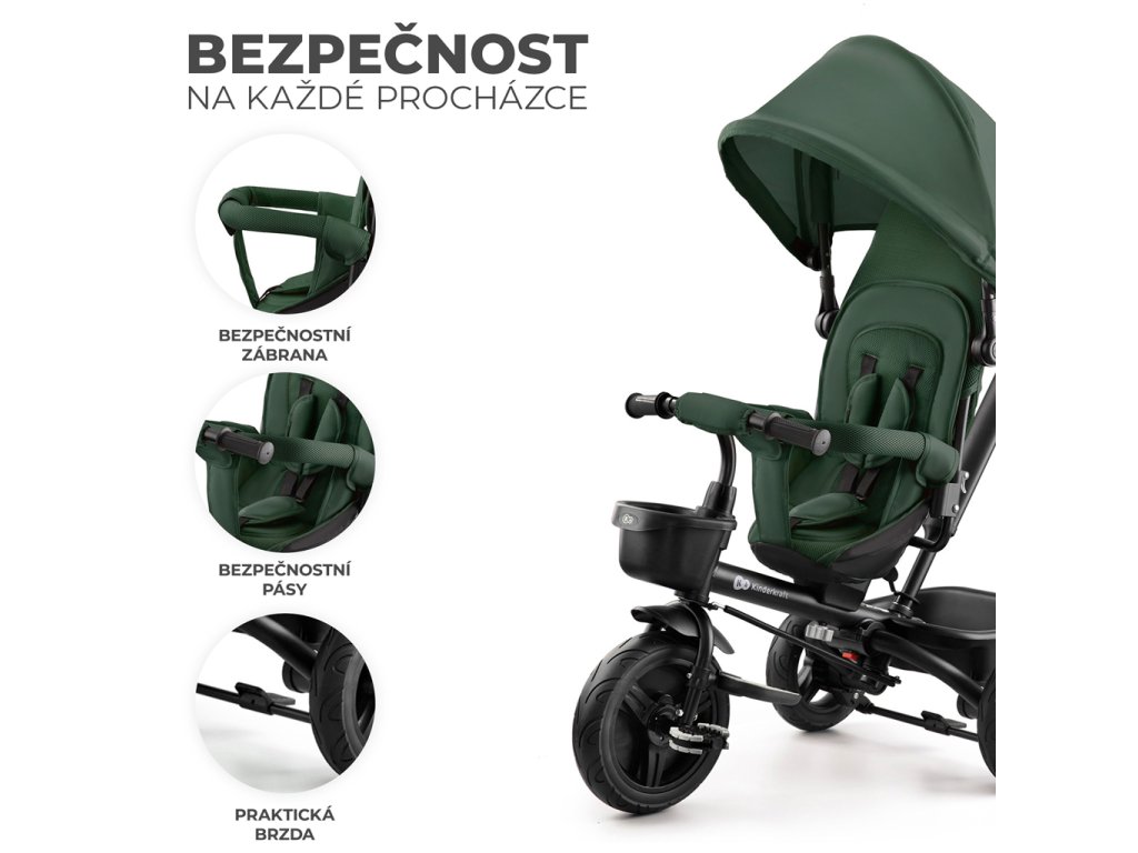 Tříkolka je vybavena nastavitelnými, 3-bodovými bezpečnostními pásy a bezpečnostní zábranou. Pásy mají měkké chrániče a pásek v rozkroku lze snadno připevnit k zábraně, čímž zvýšíte bezpečnost dítěte.