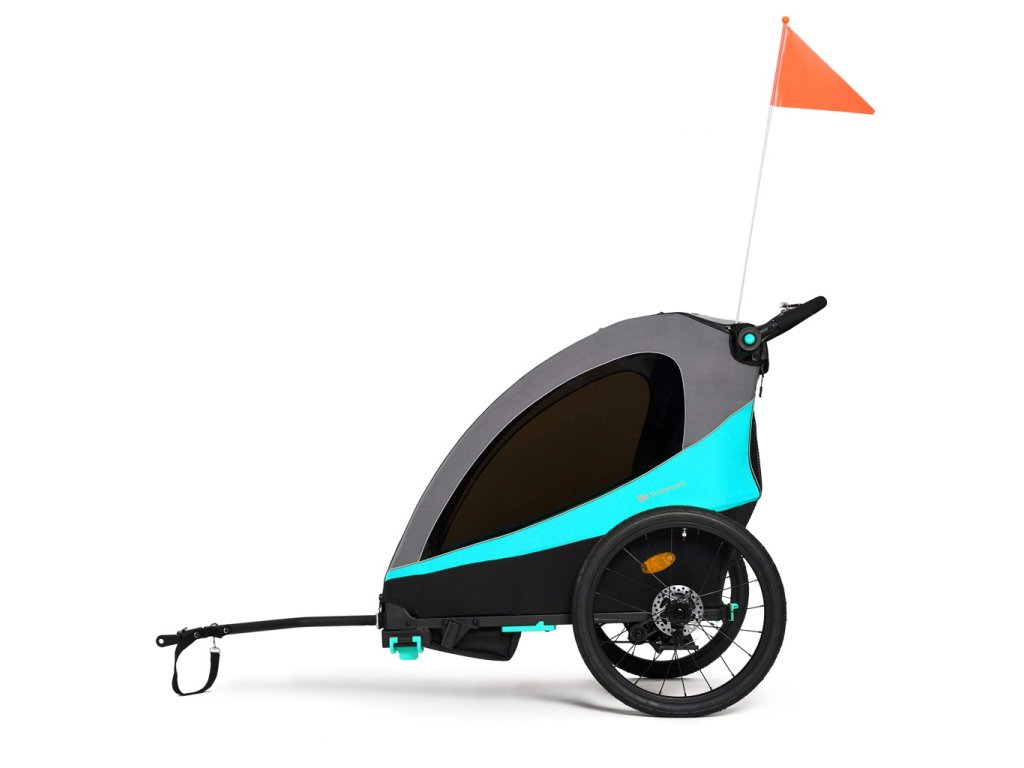 Nastavitelné, 5-bodové bezpečnostní pásy, reflexní prvky a výstražná vlajka zvyšují bezpečnost. Opěrka zad a zabudovaná opěrka hlavy umožňují pohodlnou polohu celého těla, čímž zajišťují pohodlí Vašeho dítěte během jízdy.