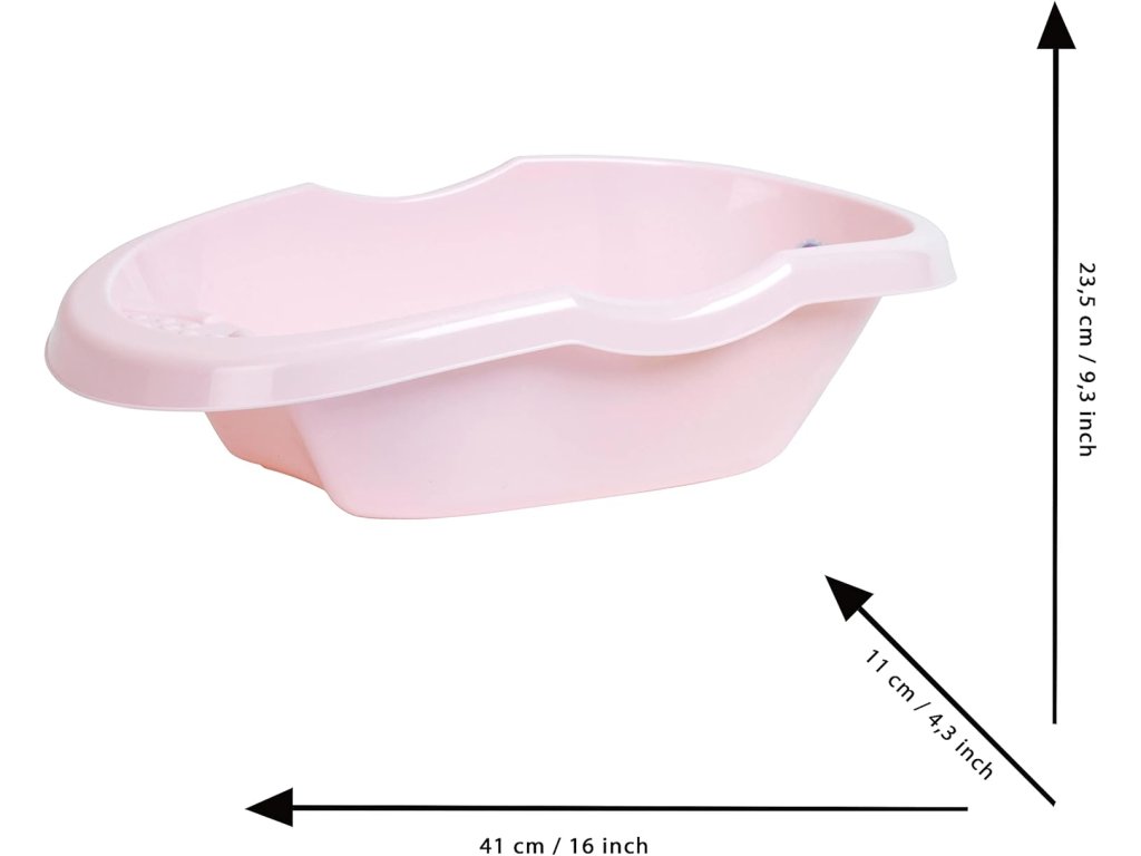 Plastová vanička pro panenku 40cm s příslušenstvím: nočníček, teploměr, plenka, hřebínek, zásyp a hračka. Vanička pro panenku je v růžové barvě.
