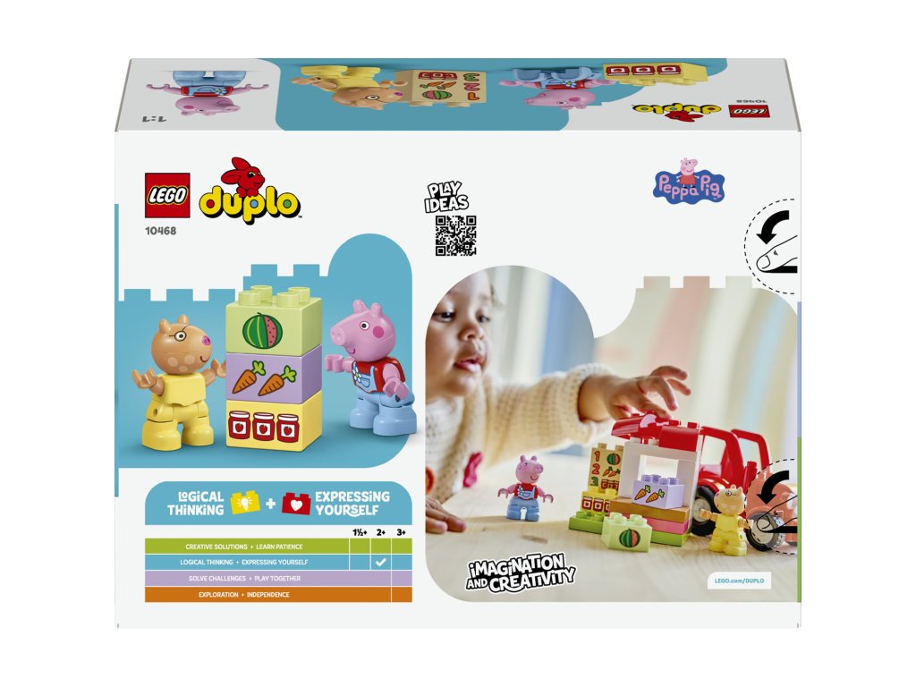 Pomozte batolatům rozvíjet kreativitu se stavebnicí Prasátko Peppa Traktor a Tržnice (10468). Děti od 2 let si užijí nápadité hraní na provoz farmářského obchodu a prodej potravin z kostek LEGO® DUPLO®. Tato stavebnice obsahuje figurku poníka Péti a Prasátka Peppy, pojízdný červený traktor a kostky v podobě mrkve, melounu a sklenice marmelády.