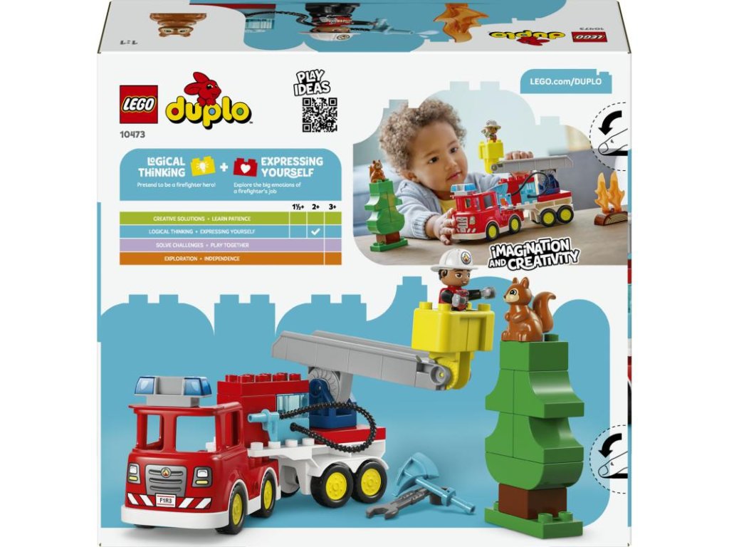 Tato vzdělávací hračka může batolatům pomoci vyvíjet a zdokonalovat důležité dovednosti. Při hraní se mohou vcítit do role statečného hasiče, který pomáhá ostatním, což přispívá k rozvoji jejich emoční inteligence. Model hasičského vozu LEGO DUPLO je nabitý zábavnými funkcemi, které děti inspirují k vyprávění kreativních příběhů o hasičích. Má sklápěcí žebřík a průhlednou nádrž na vodu z kostek LEGO DUPLO. Začínající hasiči k autu připojí hadici a uhasí oheň. Batolata si procvičí jemné motorické dovednosti při úpravě hasičského auta tak, aby mělo kloubový přívěs, který usnadňuje jízdu v zatáčkách.
