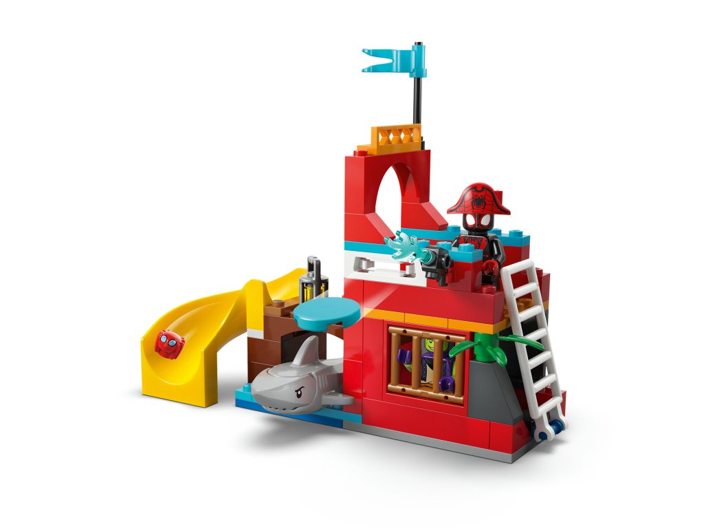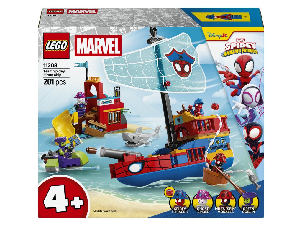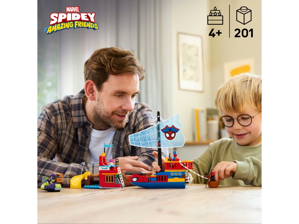 Vydejte se na plavbu plnou fantazie s kreativní stavebnicí Pirátská loď Spideyho týmu (11208) se Spideym, Zeleným Goblinem, Ghost-Spider a Milesem „Spinem“ Moralesem. Tato stavebnice pro holky a kluky od 4 let představuje skvělý způsob, jak rozvíjet dovednosti při zábavném objevování moře a Pavoučího ostrova. Tato stavebnice se Spideym je plná funkcí a obsahuje pirátskou loď, Pavoučí ostrov se skluzavkou, loď Zeleného Goblina a menší člun. Na pirátské lodi najdete dělo, na ostrově je vystřelovač disků a na lodi Zeleného Goblina najdete vystřelovače. Pomocí Spideyho pavučinového lana můžete chytat ryby, vylovit truhlu s pokladem nebo loď Zeleného Goblina. Tento dárek s motivem Spider-Mana pro fanoušky seriálu Spidey a jeho úžasní přátelé obsahuje barevný obrázkový návod, začátečnickou kostku a samostatné sáčky – v každém je jeden sestavitelný model –, díky kterým bude stavění snadnější, rychlejší a zábavnější. A s aplikací LEGO® Builder děti můžou přibližovat a otáčet modely ve 3D a sledovat postup pomocí jednoduchého digitálního návodu. Stavebnice obsahuje 201 dílků.Doplňkové parametry