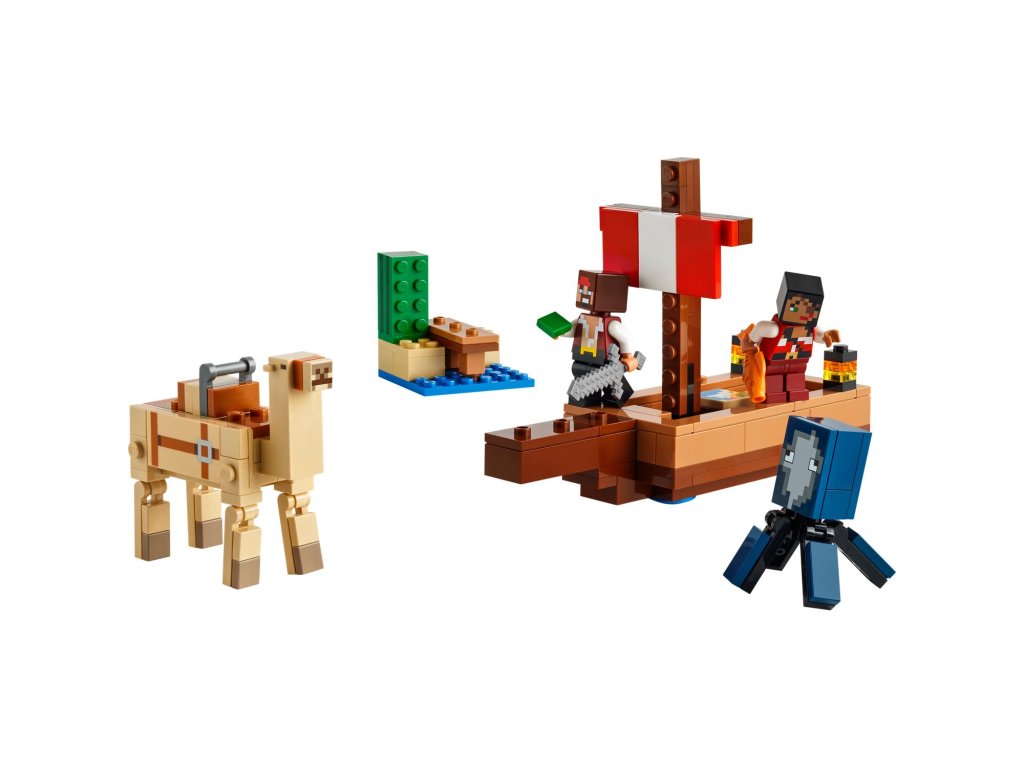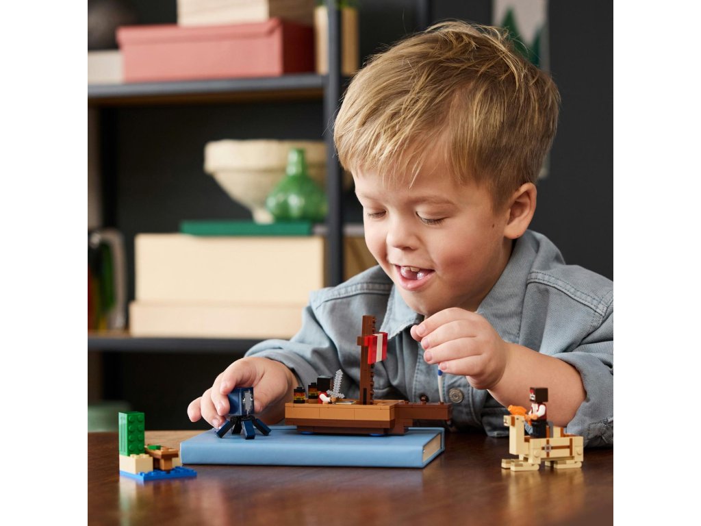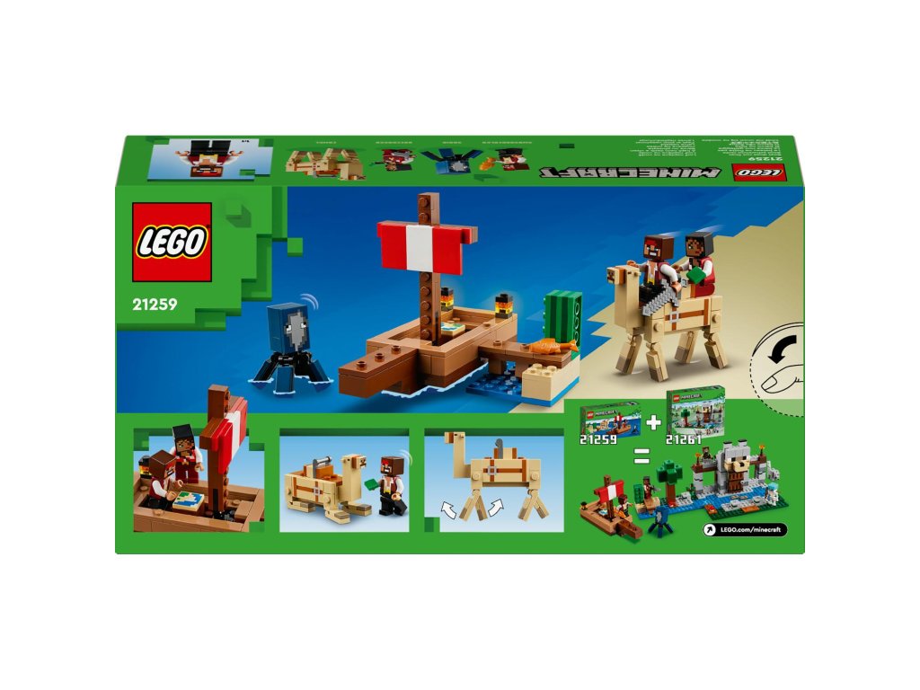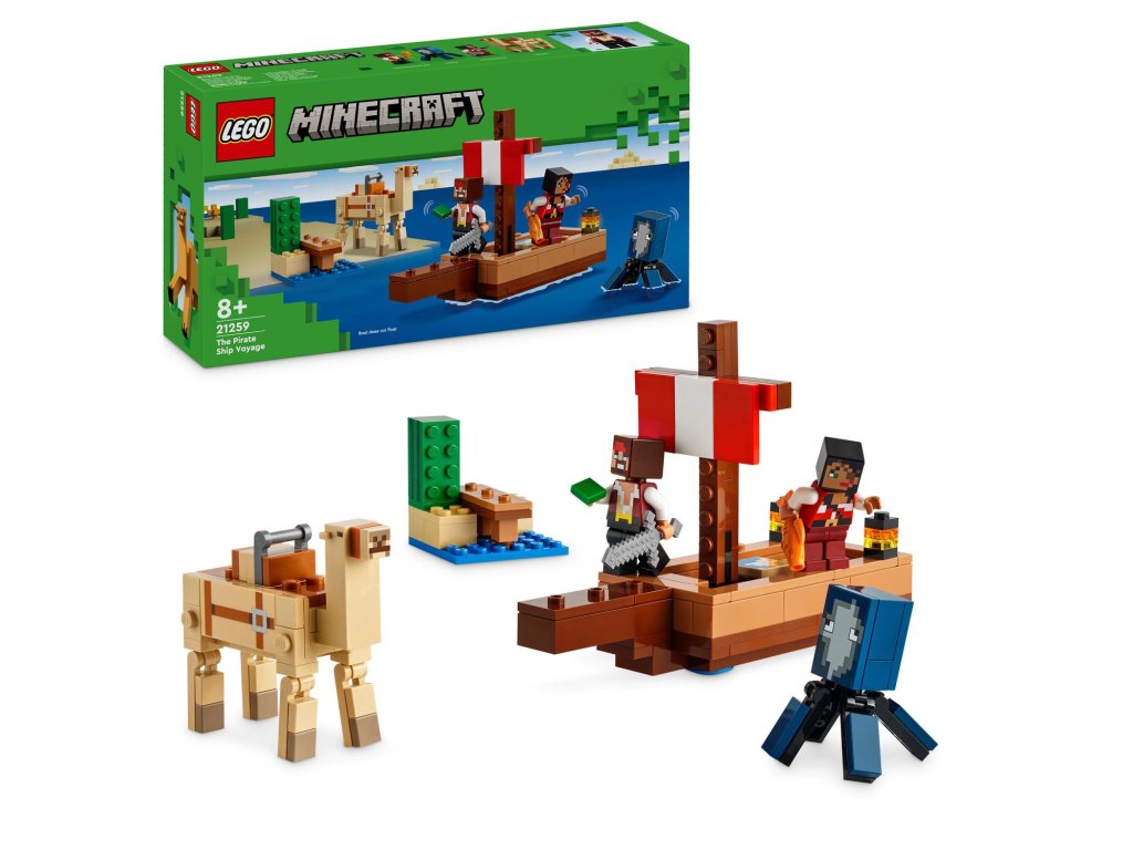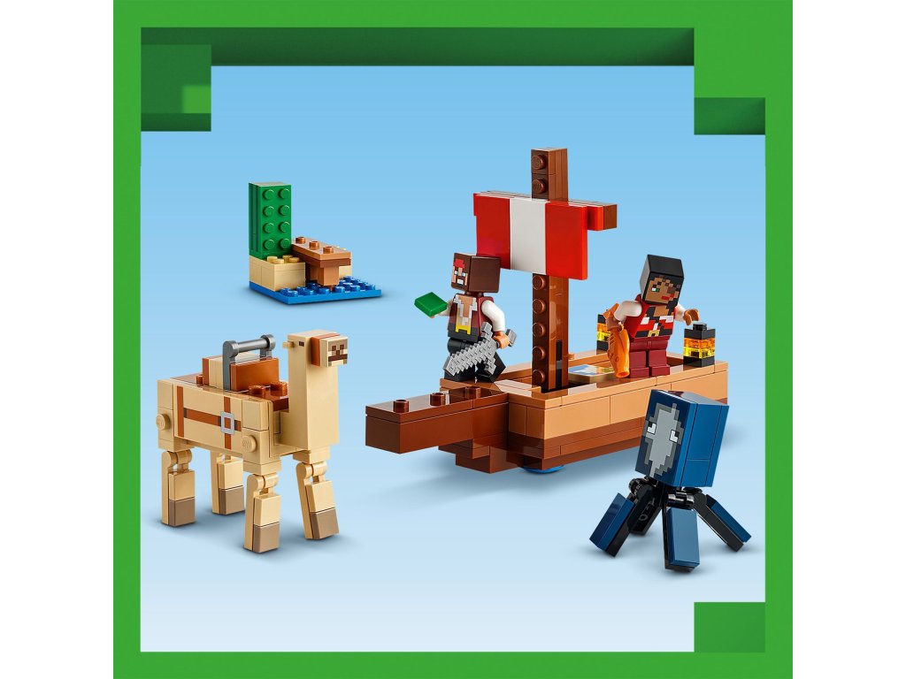 Tato dobrodružná pirátská stavebnice LEGO Minecraft obsahuje sestavitelnou loď, oliheň, velblouda, 2 figurky pirátů a doplňky. Tato speciální stavebnice LEGO s piráty, lodí a vůbec prvním dospělým velbloudem v řadě LEGO Minecraft potěší každého fanouška Minecraftu. Na dvojité sedadlo velblouda se vejdou oba piráti, kteří spolu vyrazí na další dobrodružství. Doplňky včetně ryby, mapy, železného meče a kaktusu podněcují nápadité hraní. Stavebnici lze kombinovat s dalšími sadami LEGO Minecraft (prodávají se samostatně) pro ještě více herních možností.