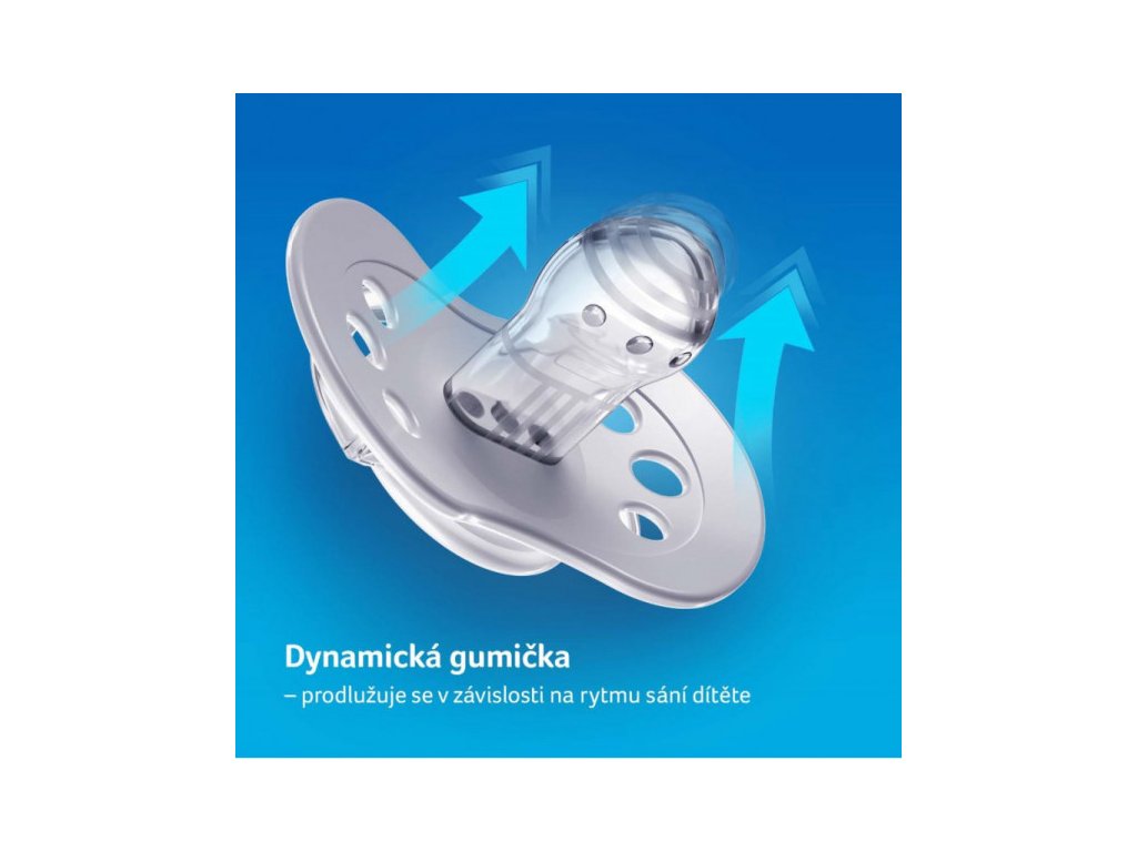 Dynamická gumička je vyrobena z nestejnorodých vrstev silikonu, takže se prodlužuje a smršťuje v závislosti rytmu sání dítěte. Symetrický tvar připomíná matčinu bradavku. Tvar gumičky také umožňuje vložení dudlíku do úst dítěte libovolným způsobem (nemá určenou vrchní a spodní stranu).