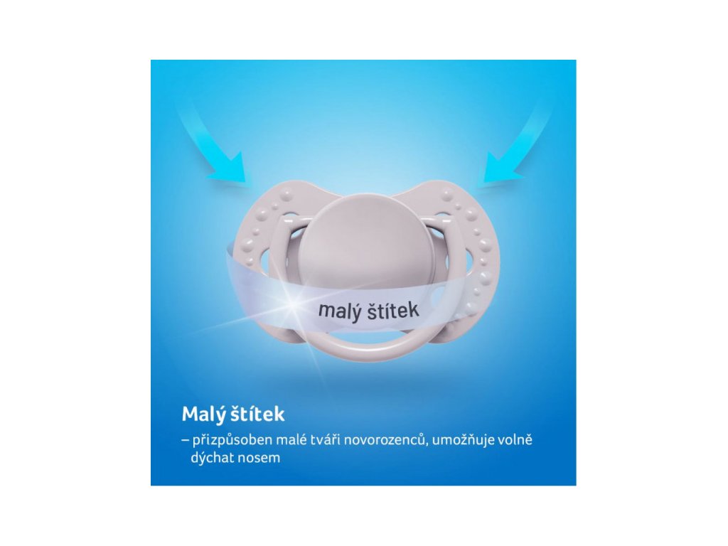 Tvarovaný zmenšený vykrojený tvar štítku umožňuje dítěti volně dýchat nosem. Je vyrobený z bezpečného materiálu, který neobsahuje BPA. Jedinečný okraj štítku je vyroben ze zdravotnického materiálu, je příjemný na dotek a zabraňuje otlačení dudlíku. Velikost štítku je proti standardním dudlíkům LOVI zmenšená.