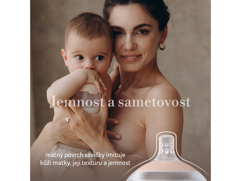 Matný jemný povrch savičky napodobuje kůži maminky, její texturu a jemnost.