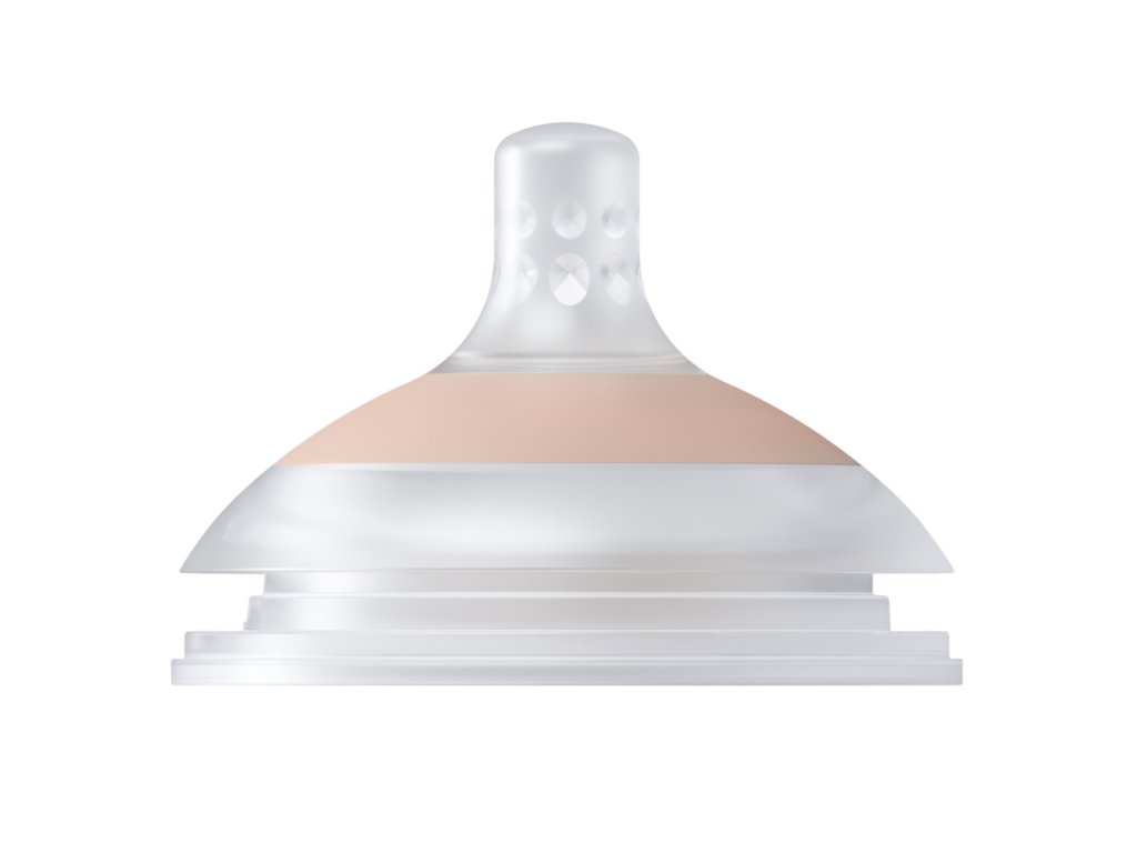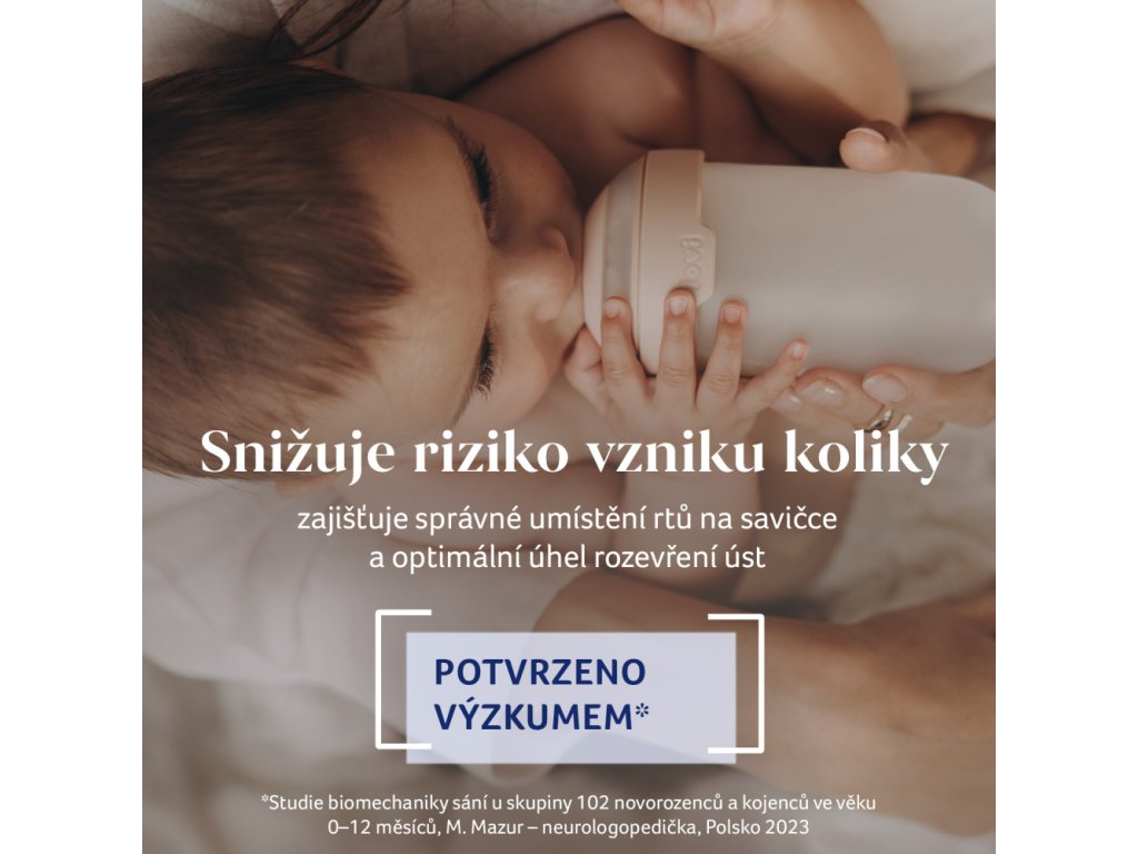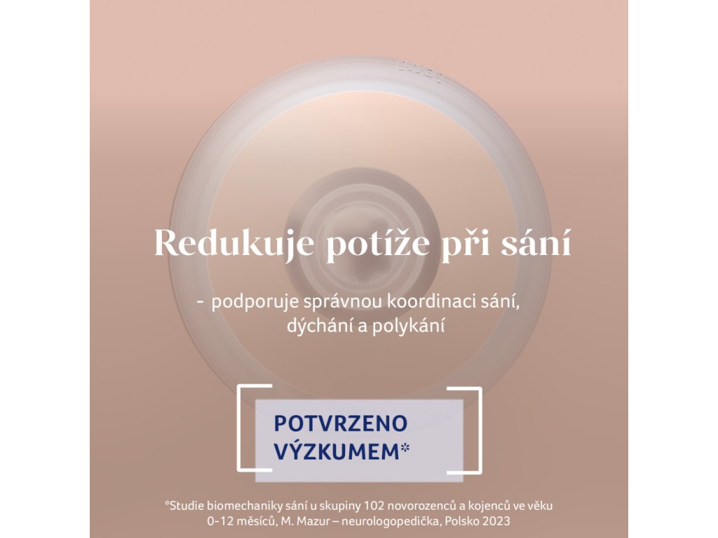 Široký, profilovaný tvar po vzoru maminčiných prsou a dokonalé proporce zajišťují, že ústa dítěte jsou umístěna ve správném úhlu, rty jsou pevně sevřené a dítě může volně dýchat nosem, což snižuje riziko vzniku koliky.
