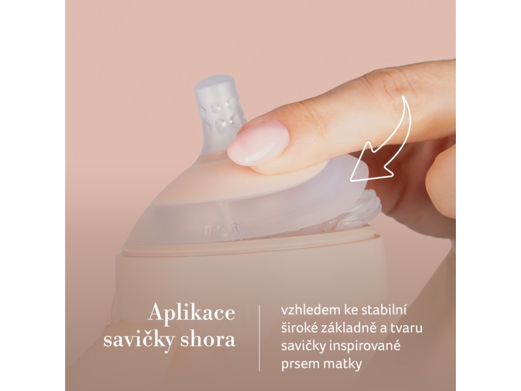 Savička by měla být nasazena z horní části šroubovací objímky (obr. 1, 1a) díky svému jedinečnému designu inspirovanému matčiným prsem. Když je savička nasazena, tvoří s objímkou jednotný celek. Speciálně vyvinutá stabilní základna savičky ze silné vrstvy silikonu se chová jako napjaté prso matky a umožňuje savičce zachovat si svůj tvar a dynamiku.