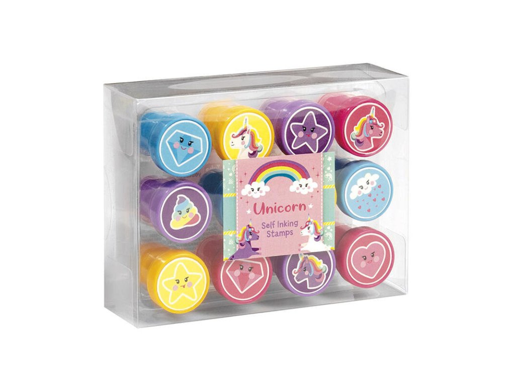Samotiskací inkoustová razítka Jednorožec. 12 motivů v sadě. Velikost: 3 cm.