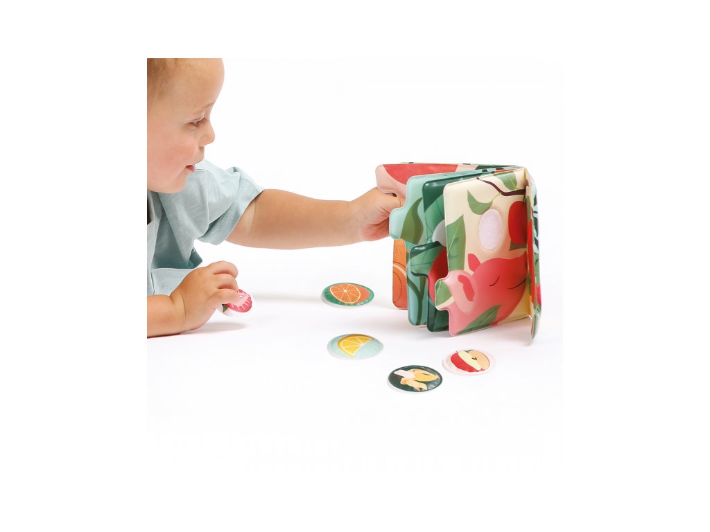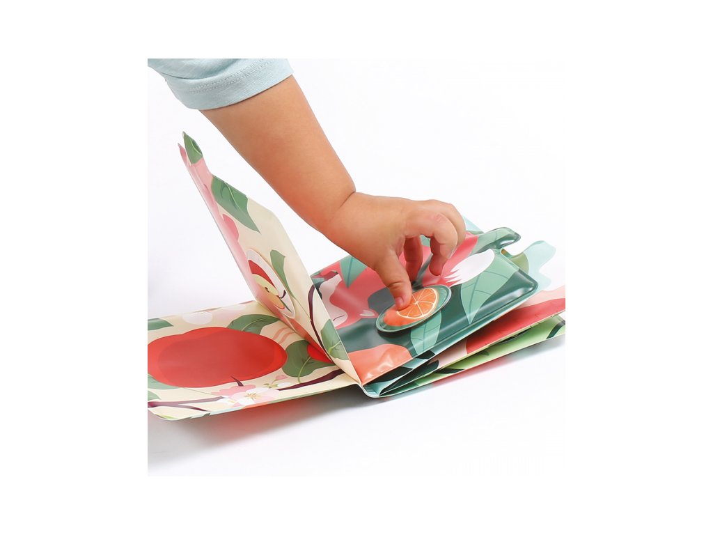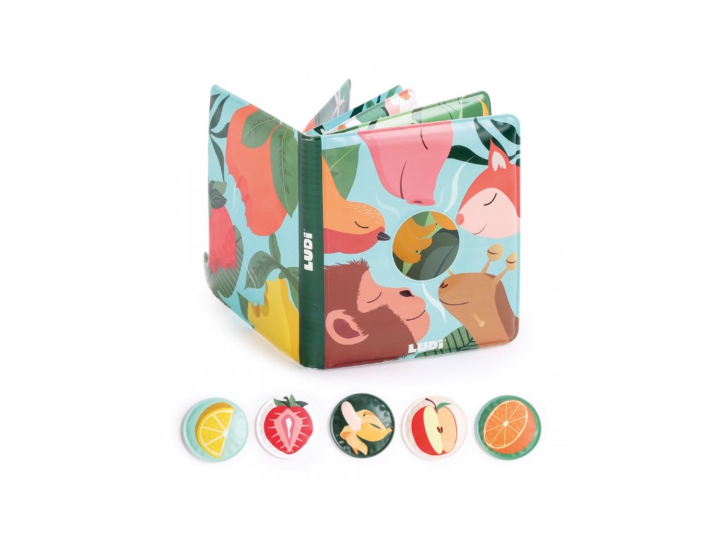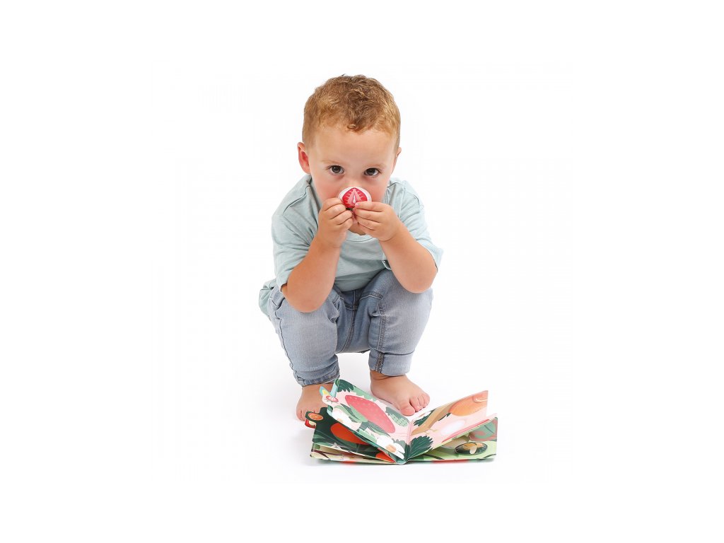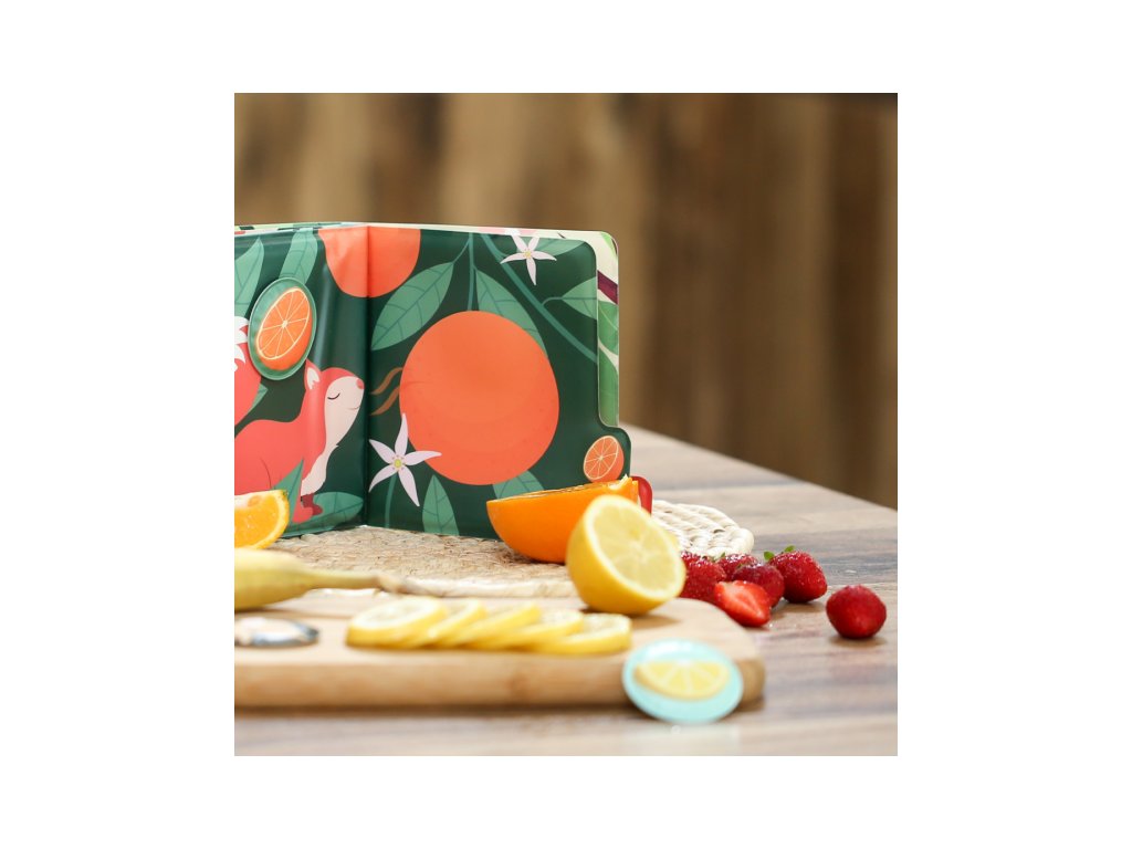 Vůně, barvy a první slova v jedné knížce! Tato interaktivní smyslová kniha s vůní ovoce vtáhne děti do světa chutí a přírody prostřednictvím veselých zvířátek a jejich oblíbeného ovoce. Každá stránka nabízí nová překvapení a probouzí zvídavost i fantazii. Knížka, která zapojí všechny smysly: Barevné ilustrace doplňuje jemná vůně ovoce, která se uvolní po přejetí prstem Děti se hravou formou učí poznávat ovoce, barvy, zvířátka i nová slova Interaktivní čtení podporuje slovní zásobu i smyslové vnímání Hra na přiřazování: Součástí knihy je 5 voňavých samolepek (broskev, pomeranč, jahoda, jablko, hroznové víno), které děti připevňují pomocí suchého zipu na správné místo Skvělá aktivita pro rozvoj čichové paměti, logického myšlení i jemné motoriky Silné stránky a snadno uchopitelné části umožňují i nejmenším čtenářům aktivně objevovat svět kolem sebe. Rozměry knihy: 15 × 15 × 3,5 cm Průměr voňavé samolepky: 5 cm Složení: 100 % PEVA Údržba: otírat vlhkým hadříkem Vhodné pro děti od 12 měsíců