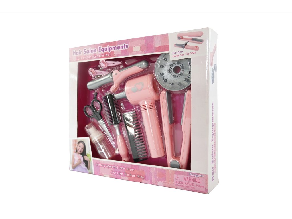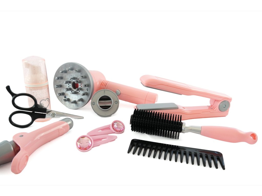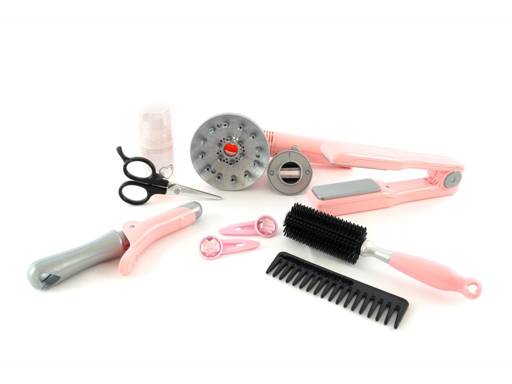 Sada pro kadeřnice v trendové šedo-růžové barvě obsahuje kulmu, fén na baterie s difuzérem, nůžky, hřebínek, kartáč, žehličku na vlasy, sponky, sprej na vlasy.