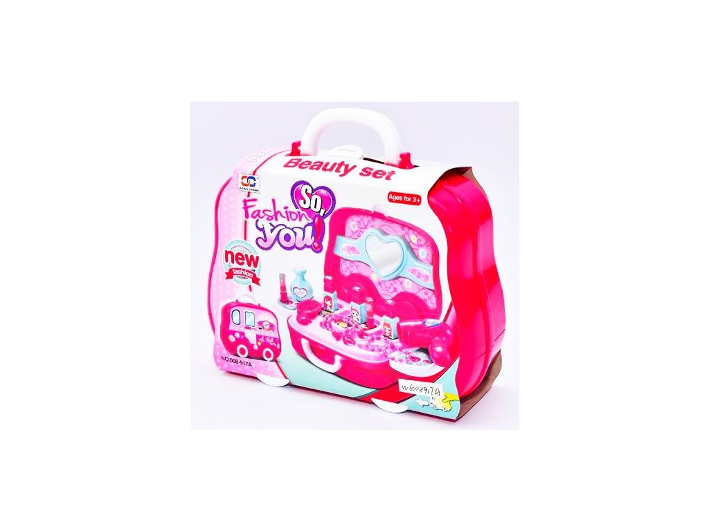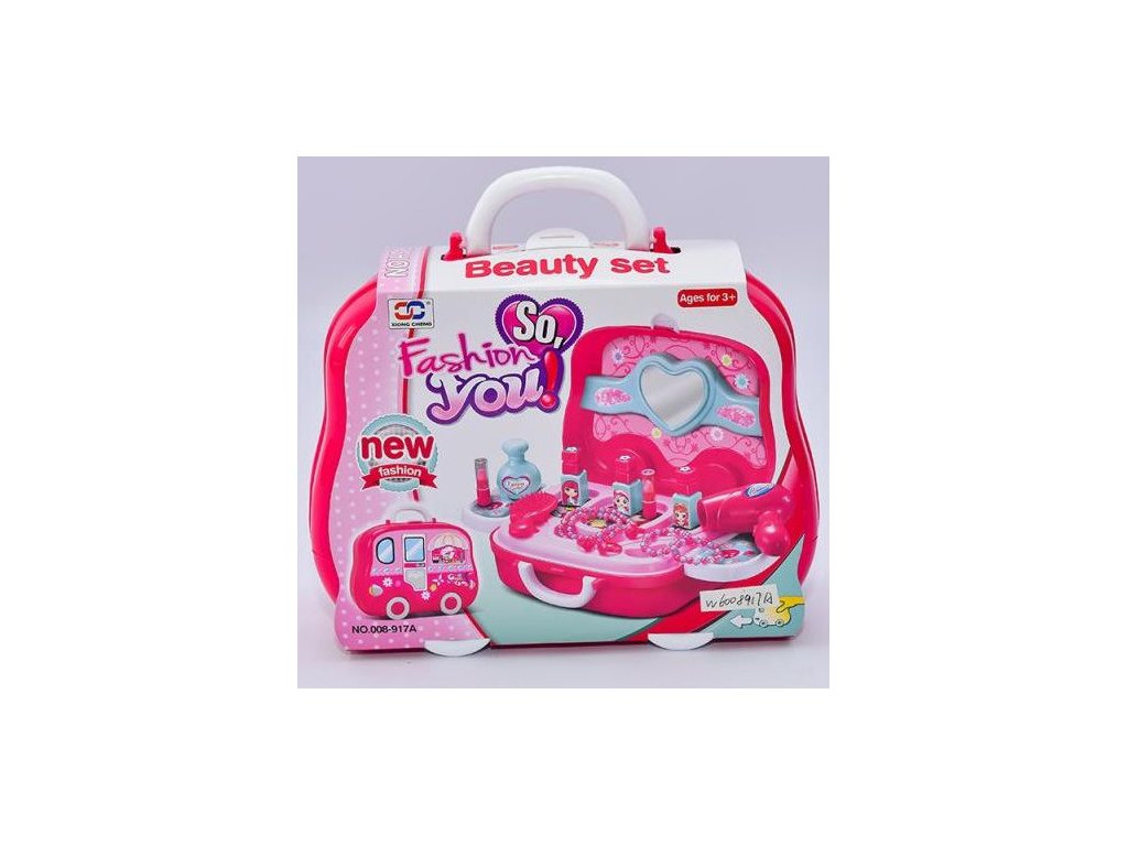 Kosmetický salon v praktickém uzavíratelném kufříku. Fén, prstýnky, náhrdelníky, hřebínky, zrcátko atd.