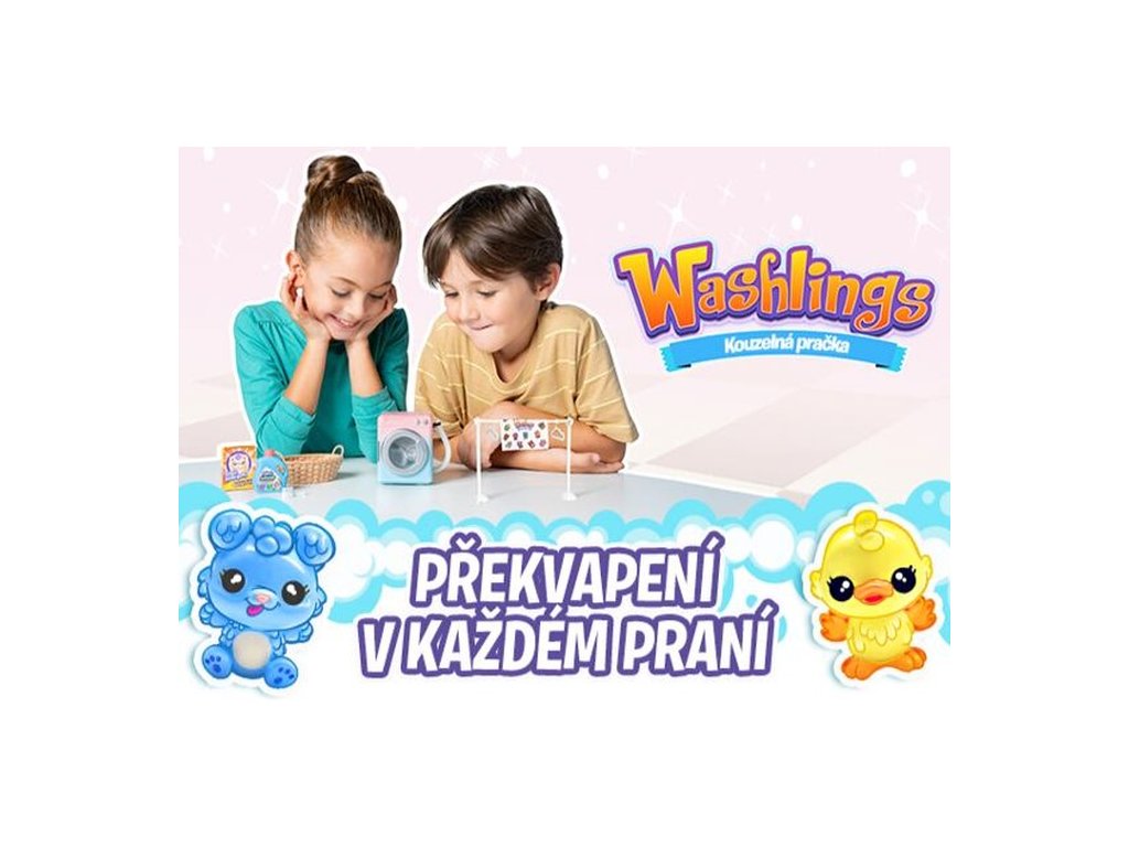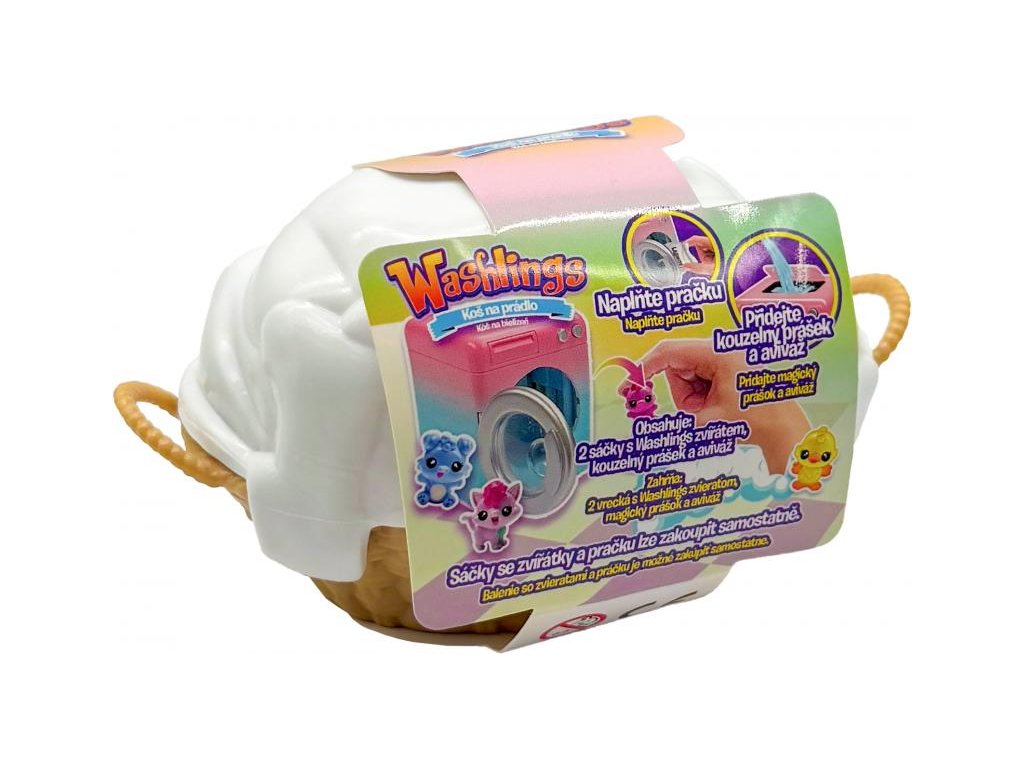 - Dvě zvířátka Washlings. Ano, správně. V koši na tebe čekají rovnou dvě zvířátka Washlings, každé schované v tom záhadném sáčku, co se při praní rozpustí. Bude to dvojité překvapení, až je objevíš.