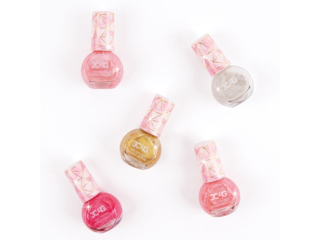 Balení obsahuje 5 laků na nehty s perletí: bílý, zlatý, stříbrnýsv.růžový a růžový.
