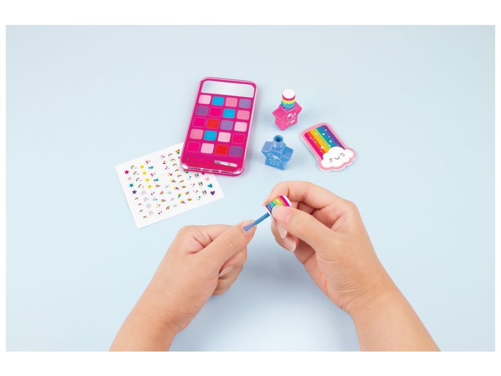 Paletka lesků na rty ve tvaru mobilního telefonu. Třpytivé aplikace, které můžete použít k tomu, abyste byly šik. Set obsahuje: 1 paletku lesků na rty s aplikátorem, 2 laky na nehty, 1 pilník na nehty a 1 arch samolepek na nehty.