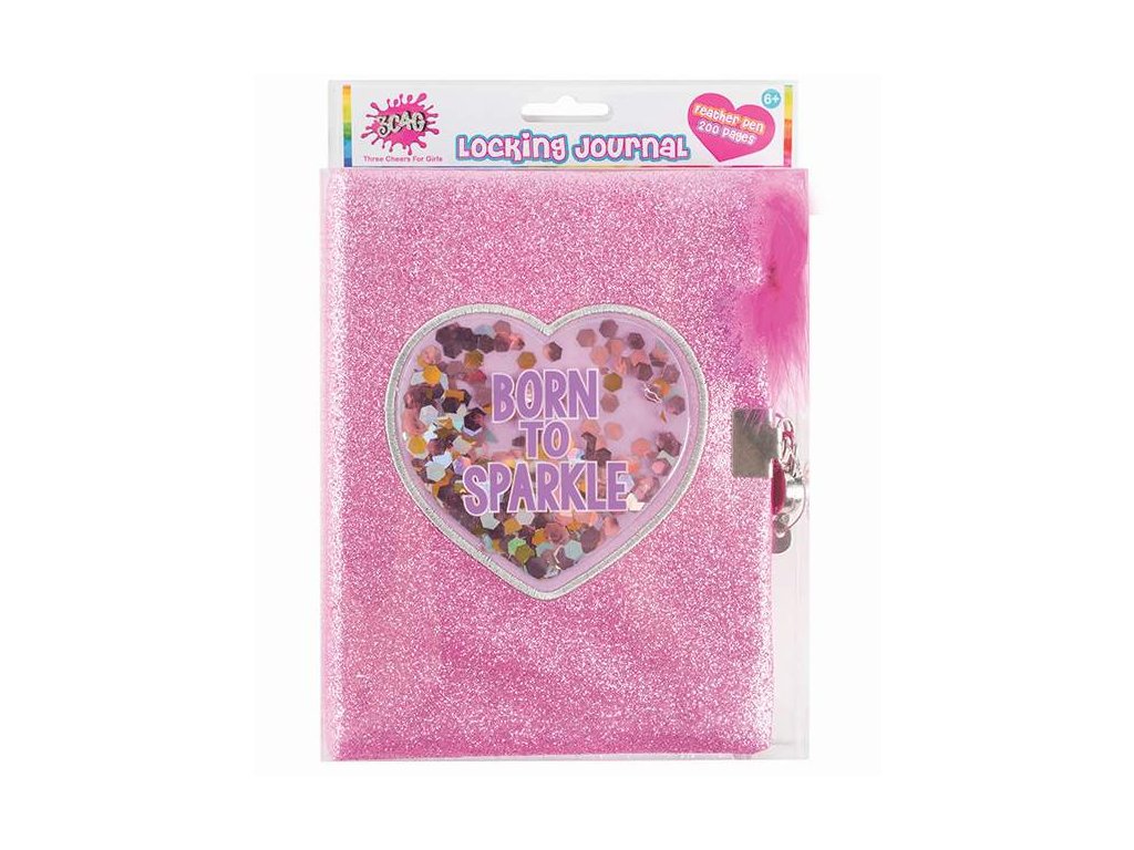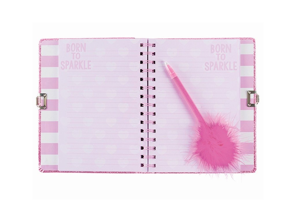 Deník se třpytivými a tvrdými deskami. Obsahuje 160 barevných stránek, pero s pírkem a zámek s klíčky.
