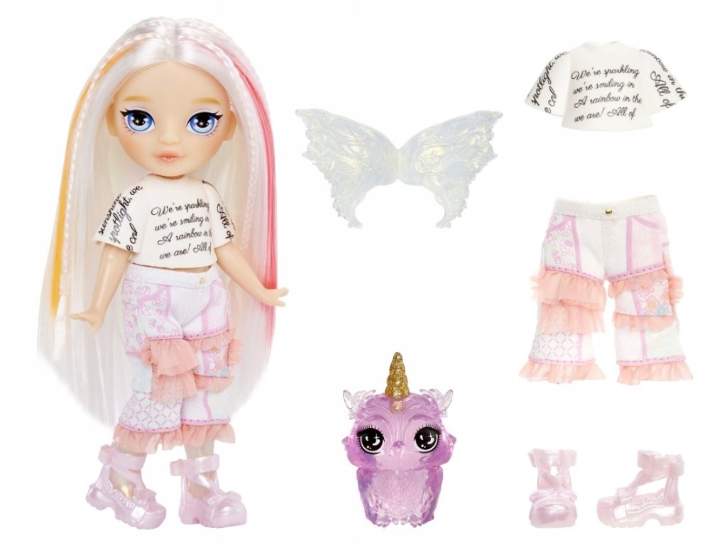 Seznamte se s novými Malými sestřičkami s křídly v kouzelných outfitech. Každá panenka má svého mazlíčka, který může nosit její křídla. Panenky mají průhledné nohy s nádechem barvy, která ladí s jejich vlasy. Obsah balení: 1 panenka s dlouhými česatelnými vlasy a kompletním outfitem, 1 pár křídel, 1 mazlíček, 1 pár bot.