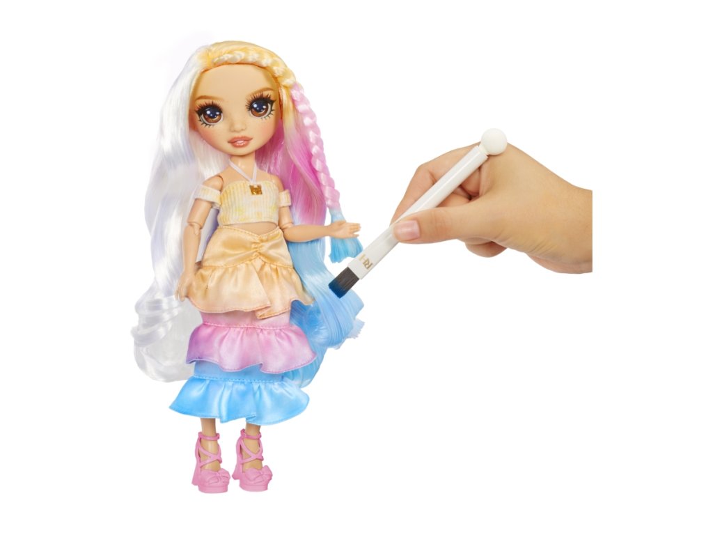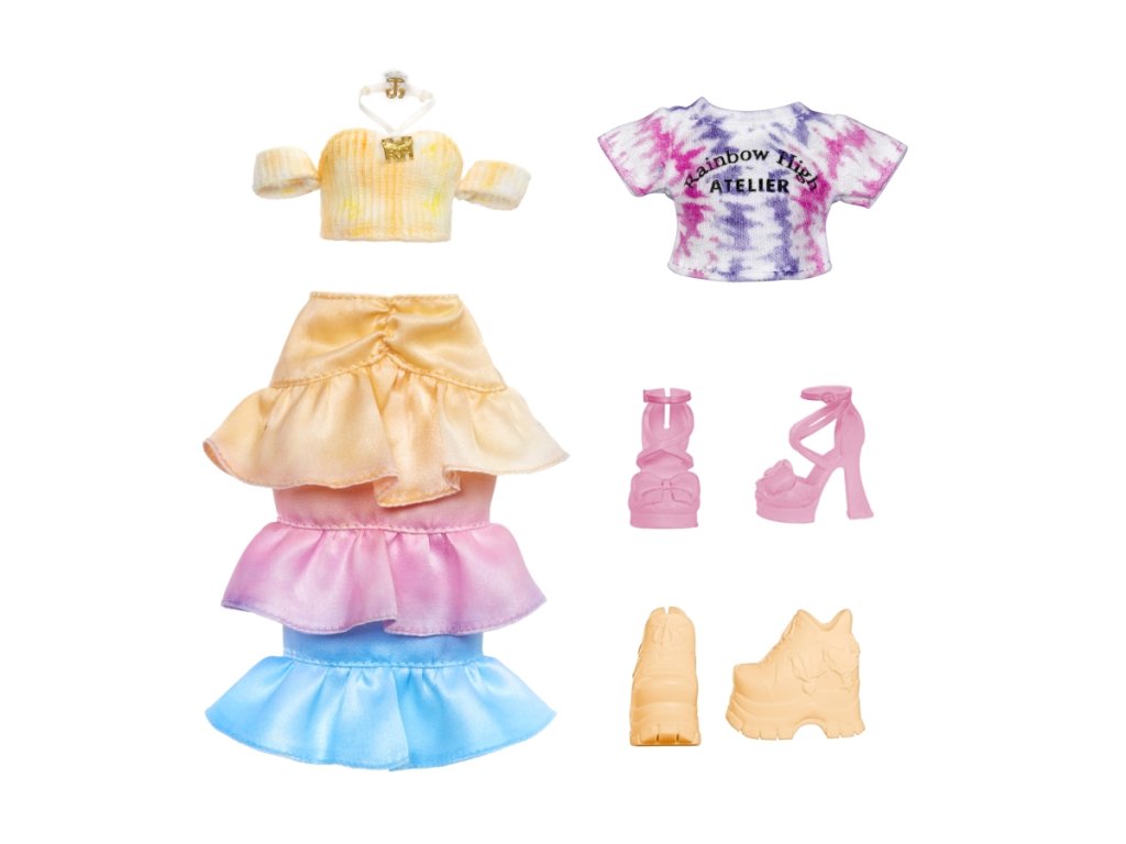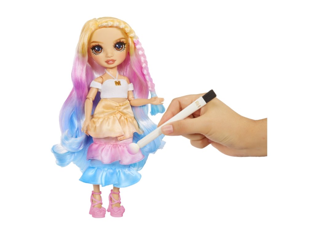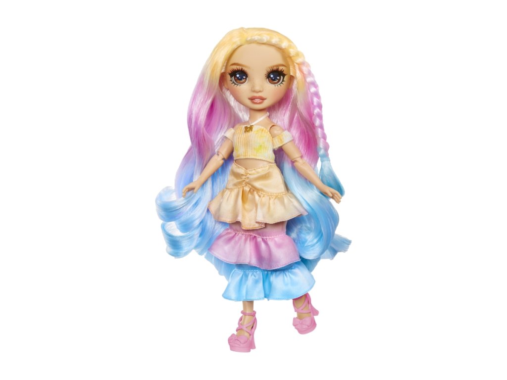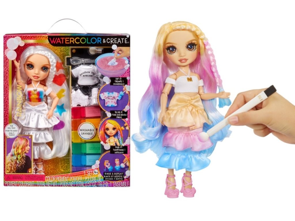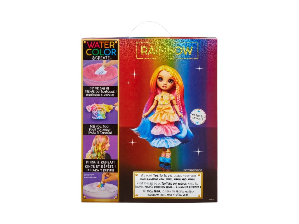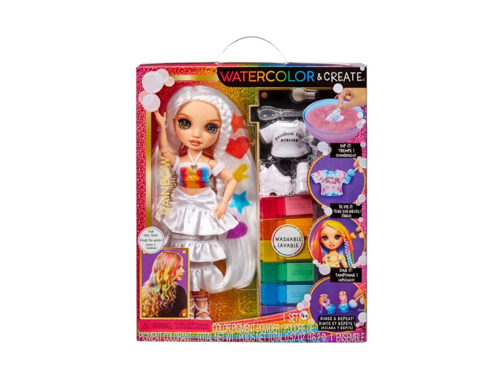 Udělejte si svou vlastní Rainbow High panenku! V balení najdeš panenku s bílými vlasy oblečenou od hlavy k patě do bílé barvy a 6 smývatelných duhových prášků (červený, oranžový, žlutý, zelený, modrý a fialový), gumičky k batikování a aplikační houbičku. Existuje nekonečně mnoho způsobů, jak vybarvit oblečení panenky nebo její vlasy. Po dokončení můžeš panenku opláchnout a vybarvit ji úplně jinak. Prášek nasypeš do vody. Do barevné vody můžeš namočit vlasy a oblečení, nebo houbičku, kterou budeš vytvářet vzory. Pomocí gumiček svaž oblečení a vytvářej různě batikovaný outfit. Obsah balení: panenka s pohyblivými klouby, bílý outfit, barevnách prášků a další doplňky k barvení oblečení a vlasů. Věk 4+