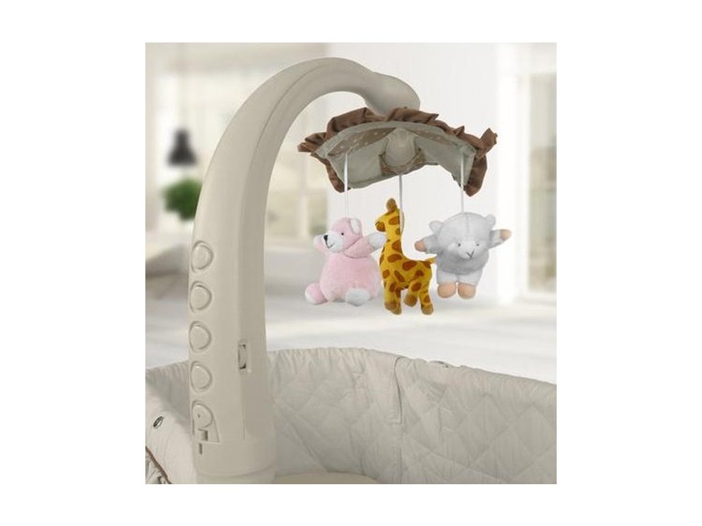 Součástí je také kolotoč s barevnými zvířátky a melodiemi. Tyto prvky přitahují pozornost vašeho dítěte a hudba pomáhá uklidnit a zklidnit vaše dítě. Kolébka má výklopnou boční stěnu, která v kombinaci s vestavěným světlem poskytuje obrovské pohodlí při denní a často i noční péči o vaše dítě. Pro pohodlí rodičů jsou tyto funkce ovládány dálkovým ovladačem.