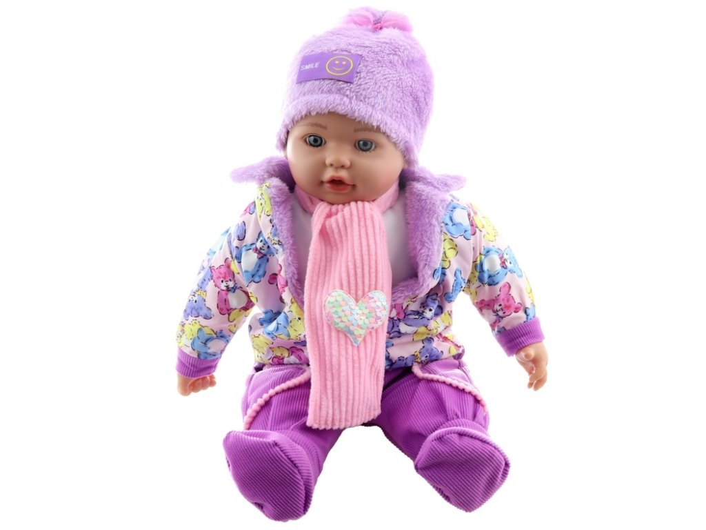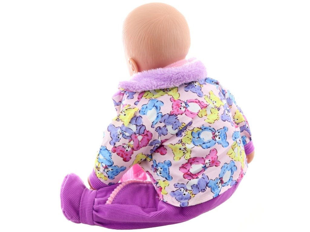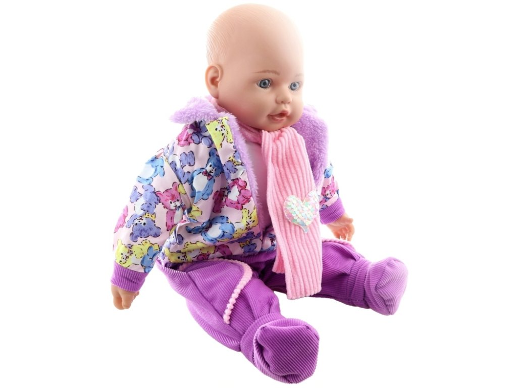 Panenka velká – miminko holka – s měkkým tělem o velikosti cca 50 x 33 x 13 cm. Oblečení lze sundat. Materiál plast+polyester+výplň. Konce končetin a hlava jsou z plastu. Baleno v sáčku. Věk 3+