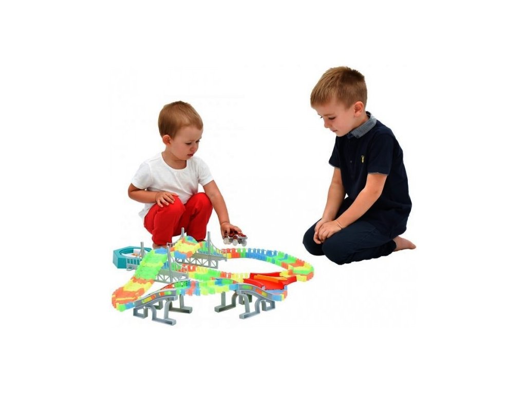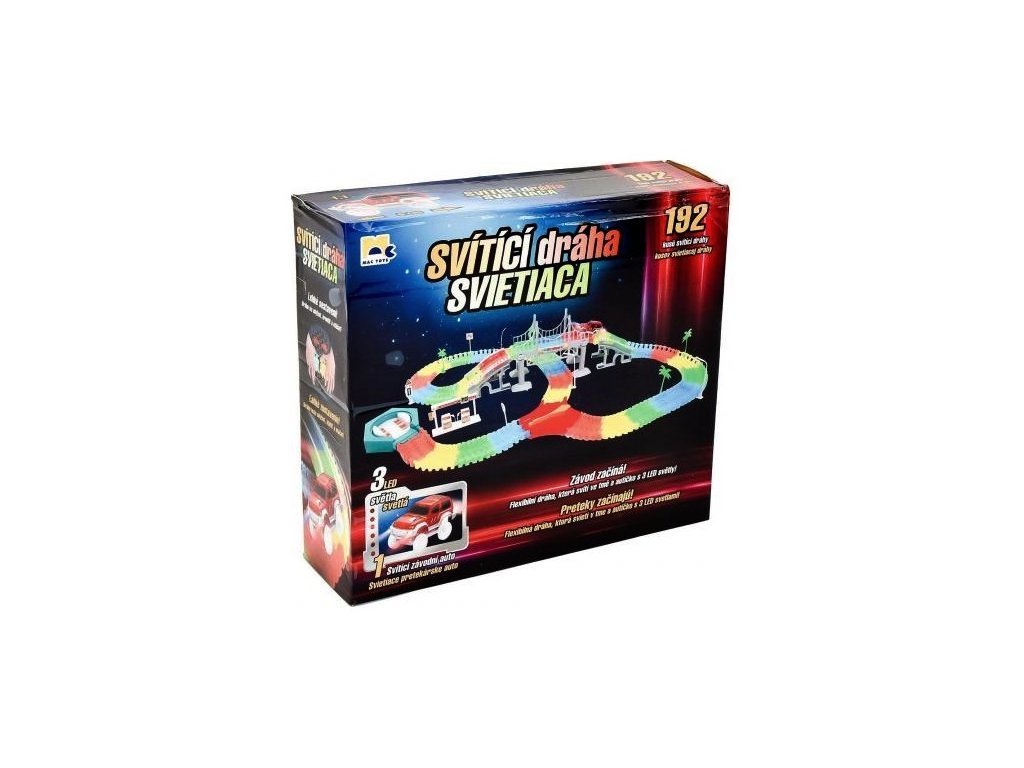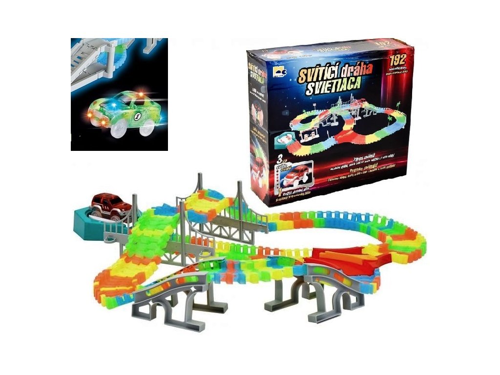 Svítící dráha s 192 díly a autíčkem, které svítí. Dráha je flexibilní a dá se z ní postavit jakýkoliv tvar. Buď kreativní a postav si dráhu podle sebe. Dráha ve tmě fosforeskuje. Pokud ji chceš uložit - stačí ji srolovat.