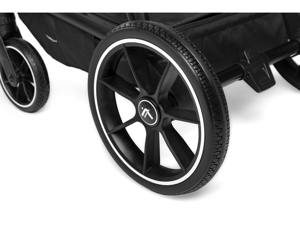 Trick je vybaven velkými, gelovými, bezúdržbovými koly a přídavným zimním fusakem. Kočárek lze jedním pohybem složit jak dopředu, tak dozadu.