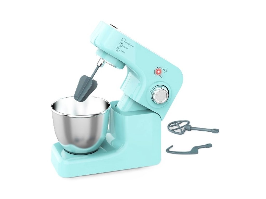 3 náhradní metly, které umožňují míchání a hnětení těsta. Stačí otočit knoflík směrem k nápisu ON a rozsvítí se červená LED kontrolka, která indikuje, že robot je v provozu.