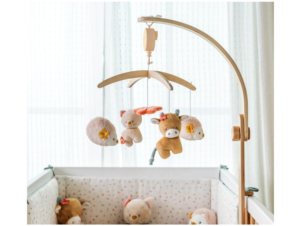 - Dřevěný hudební mobil s rotujícími plyšovými zvířátky a jemnou melodií "Le-La-Lu".