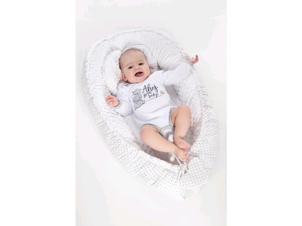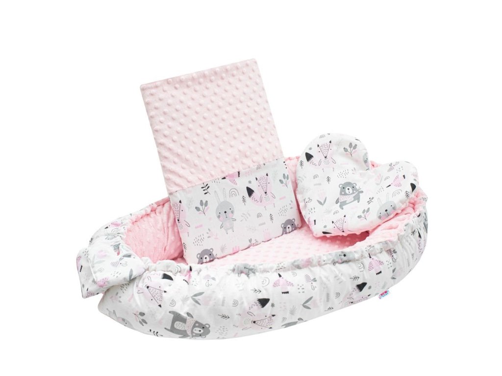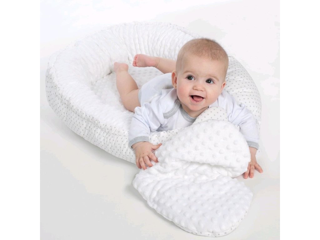 Luxusní hnízdečko s peřinkou pro miminka New Baby. Hnízdečko je praktický vynikající pomocník v prvních měsících života dítěte. Hnízdečko je oboustranné, může se používat z vnější i vnitřní strany. Hnízdečko má praktickou šňůrku, kterou lze upravovat velikost, může se více stáhnout anebo úplně uvolnit. Hnízdečko je vyrobené ze dvou typů tkanin, první je velmi měkká a na dotek příjemná, hebká Minky látka s výstupky pro stimulaci senzomotoriky a druhá je 100% bavlna. Součástí hnízdečka je polštářek ve tvaru srdce a peřinka zdobená srdíčkem. Hnízdečko má mnoho využití, lze používat v postýlce, v kočárku, na pohovce i na zemi.