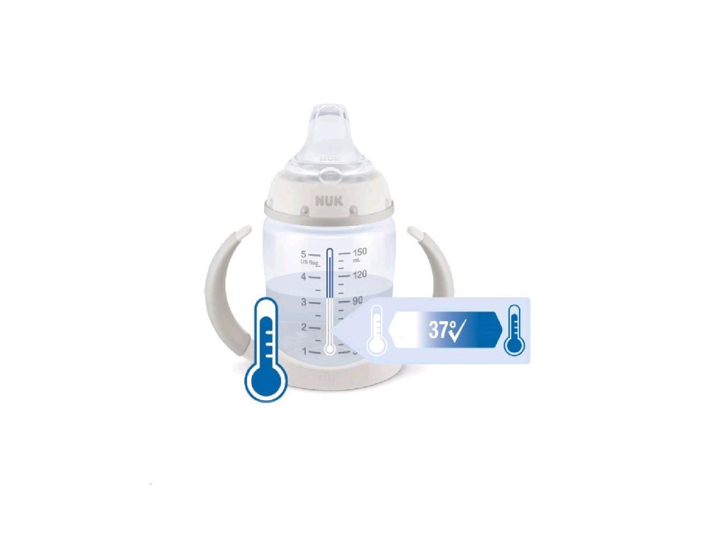 Dětská lahvička na učení NUK First Choice s kontrolou teploty To je dobrý pocit! Když nastane shon a zmatek, je dobré vědět, že nejste na všechno sama. Když se z miminka stane batole, dětská lahvička NUK First Choice s kontrolou teploty pomůže bezproblémovému přechodu k samostatnému pití. Dětská lahvička na učení NUK First Choice s kontrolou teploty ukáže, kdy má obsah láhve tu správnou teplotu – máte tak jistotu, že nápoj vašeho dítěte není příliš horký. Pokud je nápoj příliš horký, modrá barva indikátoru se změní na bílou. Tekutina by měla mít ideálně tělesnou teplotu (37 °C = středně modrý odstín).