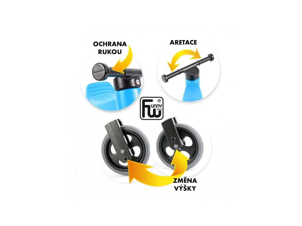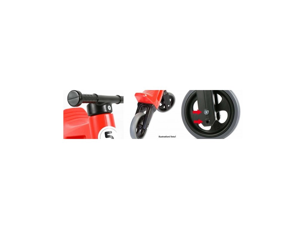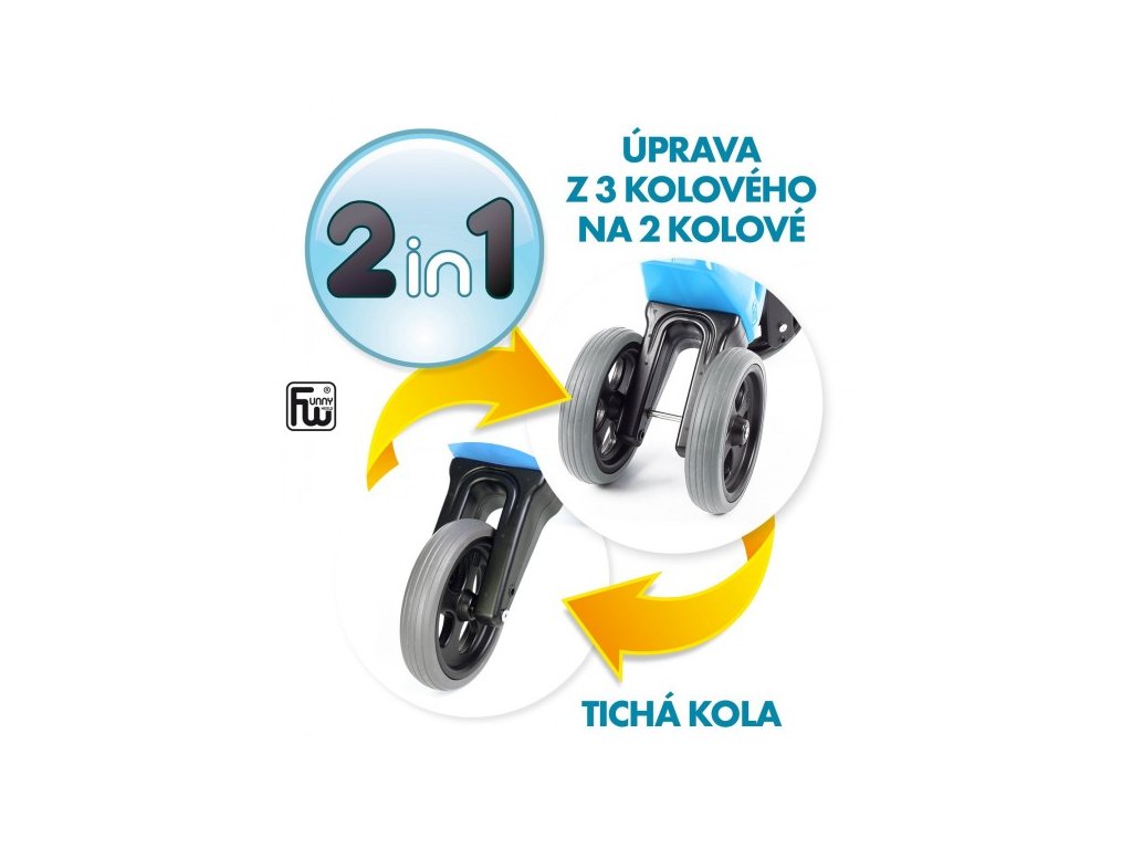FUNNY WHEELS SPORT novinka s pneumatikami, díky kterým má odrážedlo tichý provoz a kola se nekloužou. A jedééém! FUNNY WHEELS je originální české odrážedlo, které dokáže růst s vaším dítětem. Vzhledem k tomu, že můžete vyměnit dvě zadní kola za jedno a nastavit jeho výšku, nemusíte kupovat každý rok nové odstrkovadlo. FUNNY WHEELS vám vydrží, dokud nebudete kupovat první kolo. Hlavní výhody FUNNY WHEELS: 2v1 – během pár minut změníte tříkolové odrážedlo na dvoukolové 2 výškové polohy – nastavíte vpředu i vzadu (rozdíl 3 cm) Tiché pneumatiky, které nekloužou na výběr v 6 barvách – zelená, červená, modrá, růžová, oranžová, šedá cool design bezpečné i pro ty nejmenší z odolného a nezávadného plastu, se zahlazenými spoji omyvatelné vlažnou vodou a mýdlovými čisticími prostředky kompletně vyrobené v České republice FUNNY WHEELS roste stejně, jako váš prcek. Ten začne jezdit na malém tříkolovém odrážedle, až se vytáhne, jednoduše FUNNY WHEELS zvednete o 3 cm výš a jede se dál. Až přijde čas trénovat balanc, jednoduše vyměníte dvě zadní kolečka za jedno a dítko se může začít připravovat na jízdu na kole. Jak přesně to funguje, vidíte na videu. Odstrkovadlo je přitom stabilní (ve variantě se třemi koly). Vidlice má omezený rozsah otáčení a řídítka se tak nemohou přetočit. Rukojeti řídítek jsou na konci rozšířené, a tím chrání dětské ruce před poraněním. Odrážedlo je hračka, která baví snad každé dítě. S FUNNY WHEELS si užije radost z pohybu, zlepší si své motorické schopnosti a koordinaci, natrénuje pozornost, rovnováhu a třeba si i zazávodí! Vaše společné procházky budou delší, rychlejší a zábavnější. Technické parametry: doporučený věk: od 18 měsíců nosnost: 50 kg váha odrážedla: 1,5 kg výška sedla: 27/30 cm šířka řidítek: 30 cm rozteč zadních kol: 20 cm průměr kola:19 cm šířka pneumatiky: 4 cm Odrážedlo koupíte sestavené jako tříkolové. Součástí balení jsou dva imbusy a kratší osa na zadní kolo pro úpravu odrážedla na dvoukolové. V budoucnu bude možné zakoupit i náhradní díly – samostatná kola a osy.Plastové odrážedlo - odstrkovadlo, které dítěti usnadňuje přechod z koloběžky nebo tříkolku na šlapací kolo.