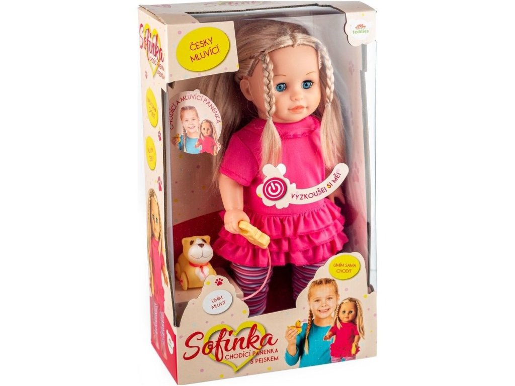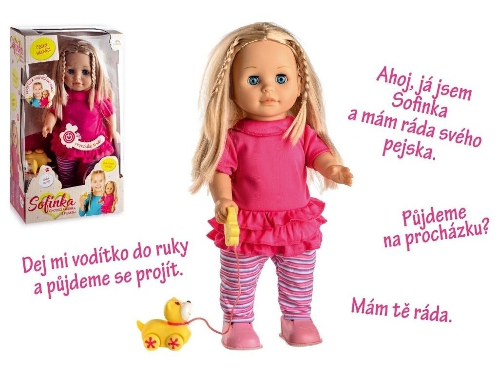 Po stisknutí tlačítka na bříšku začne panenka povídat: "Ahoj, já jsem Sofinka a mám ráda svého pejska. Pomůžeš mi vymyslet jeho jméno? Budeme si spolu hrát? Dej mi vodítko do ruky a půjdeme se projít. Mám tě ráda...." a když jí dáte vodítko do ruky, začne chodit, na baterie.