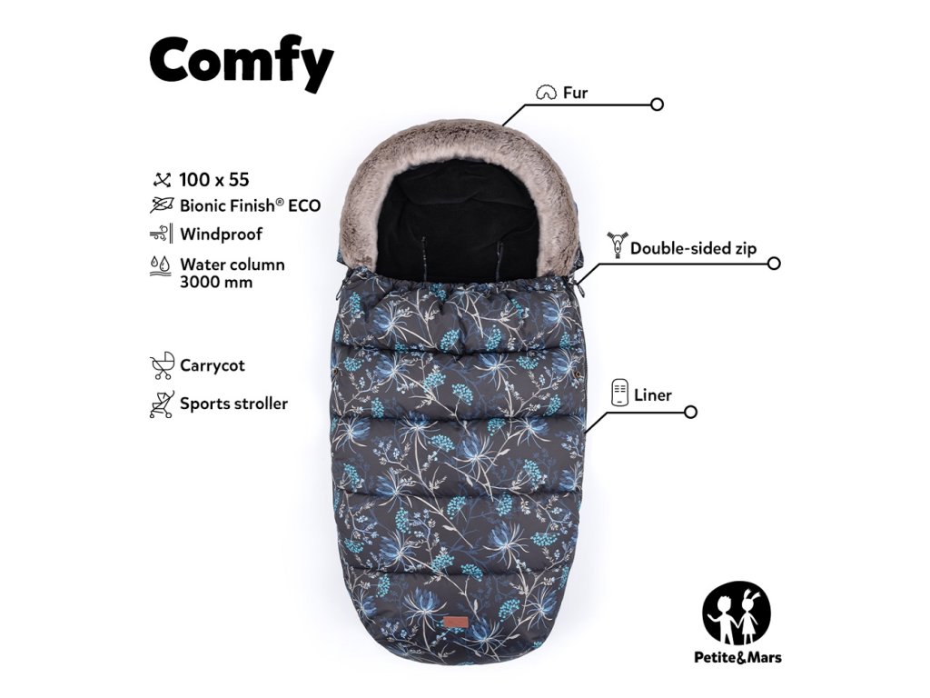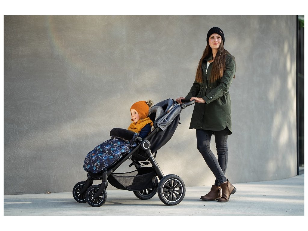 - Ve spodní části se zipy setkávají, jejich rozepnutím vznikne praktický otvor na nožičky děťátka. V zadní části je inteligentní prohnutá kapsa, která zabraňuje sklouznutí fusaku.