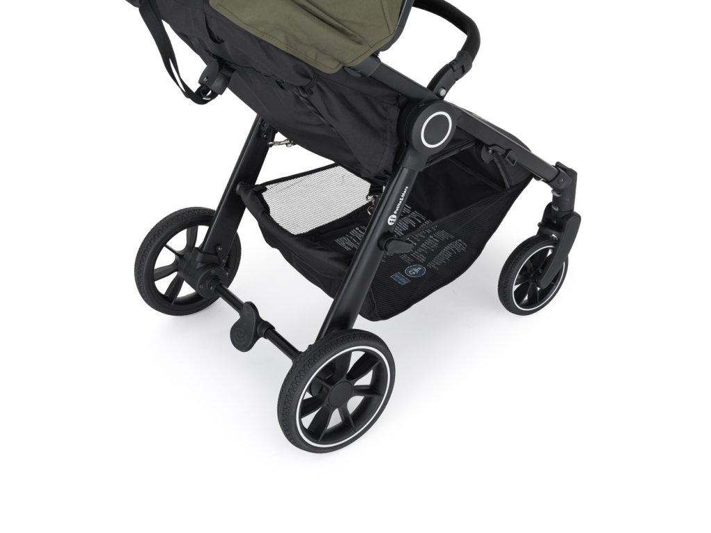 - Kvalitní úchyt kol, který zajišťuje stabilitu kočárku během jízdy.