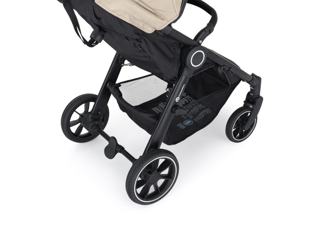 - Kvalitní úchyt kol, který zajišťuje stabilitu kočárku během jízdy.