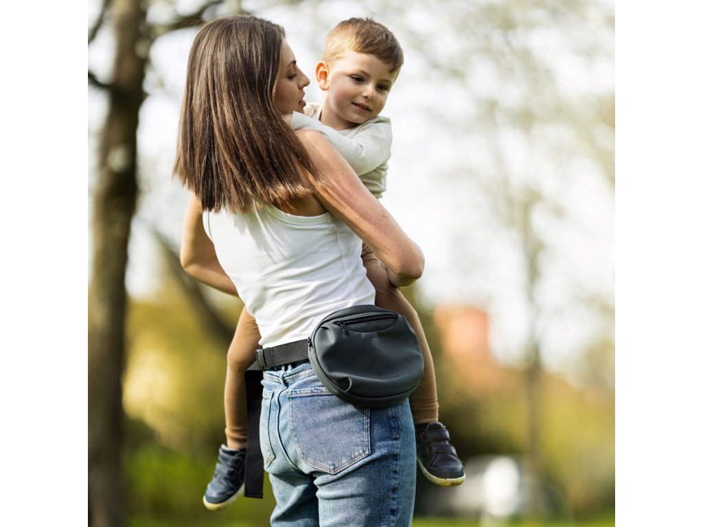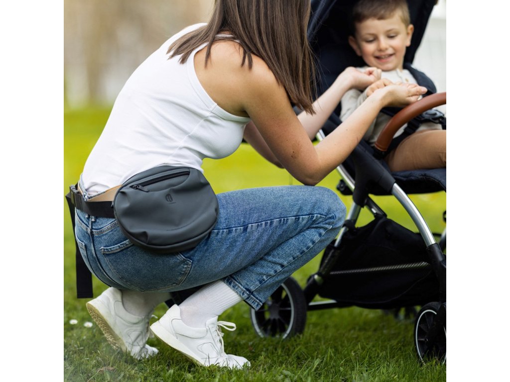 Je vyrobena z kvalitních materiálů odolných vůči vlhkosti. Má širokou přihrádku, do které se vejdou nejnutnější věci, jako například telefon nebo peněženka, a 2 menší kapsy včetně vnější. Dlouhý nastavitelný popruh vám umožní nosit ji na bedrech jako klasickou tašku na opasek, přes rameno jako messenger tašku, jako crossbody tašku nebo ji připevnit na kočárek.