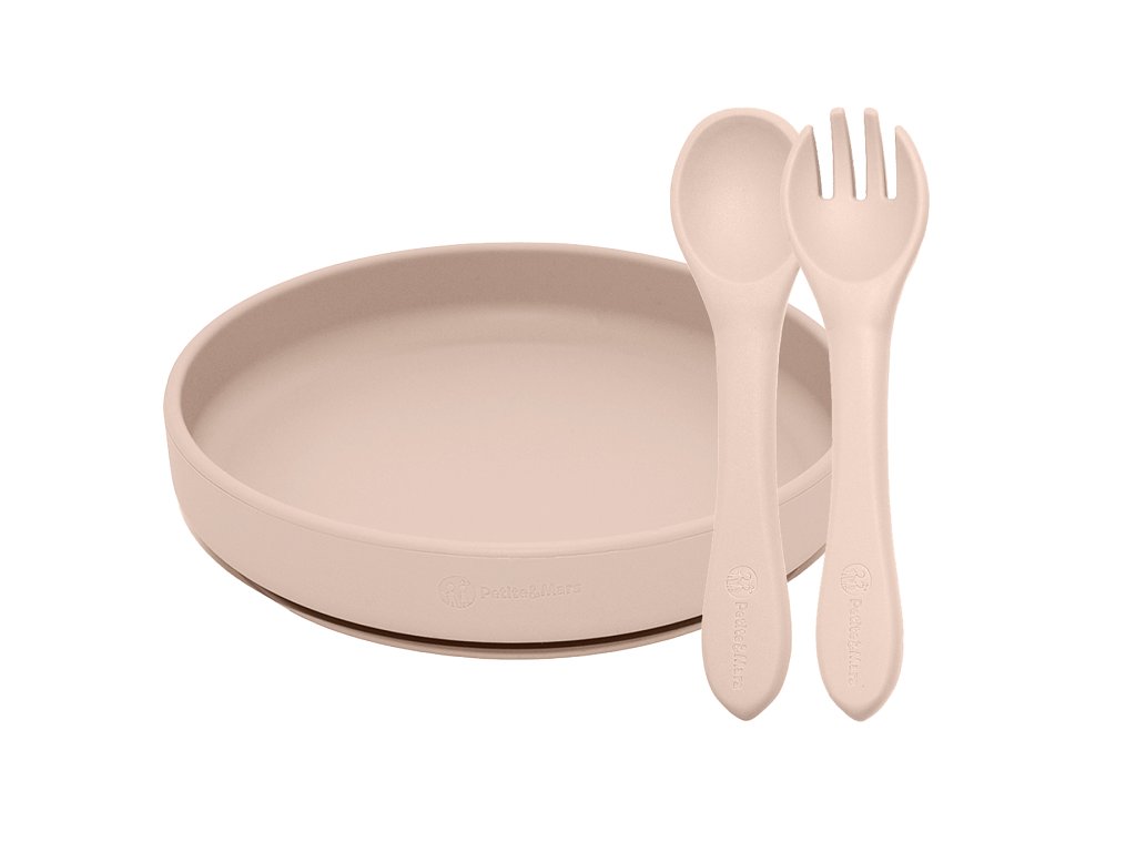 PETITE&MARS Set jídelní silikonový TAKE&MATCH 2 ks talíř + příbor Deset Sand 6m+