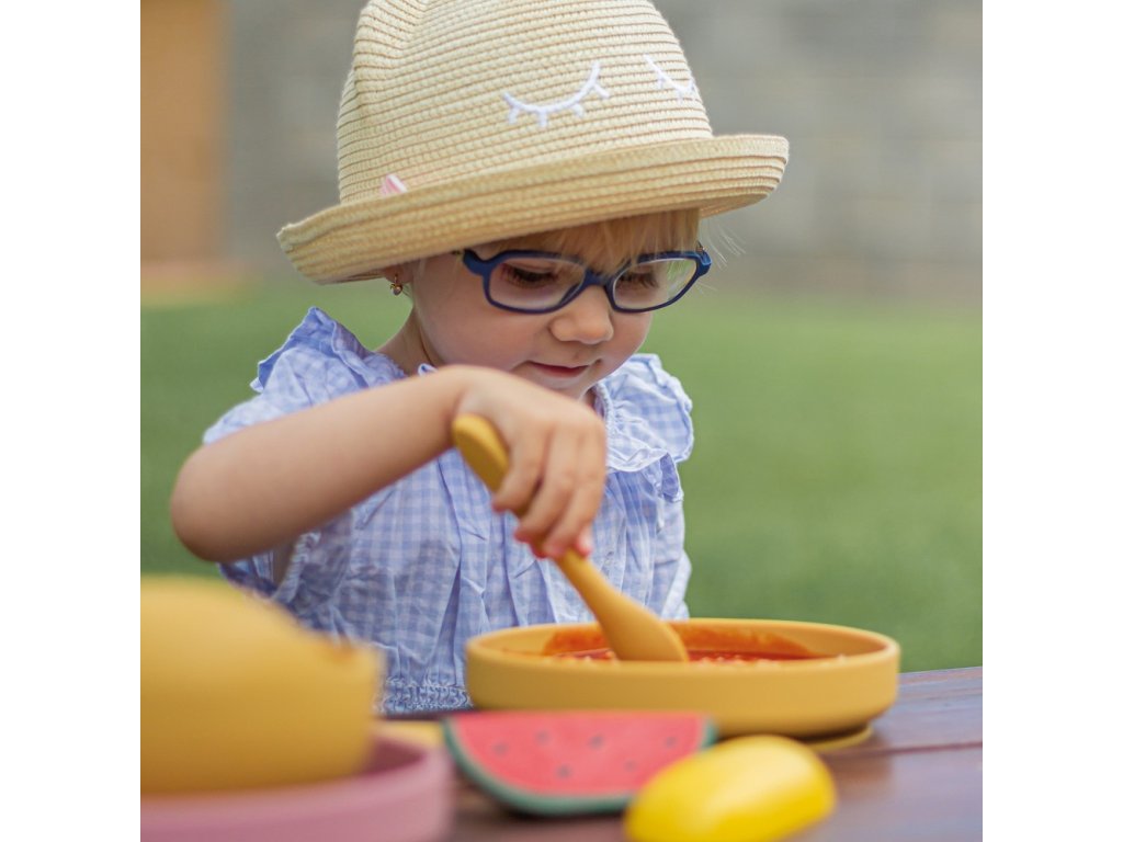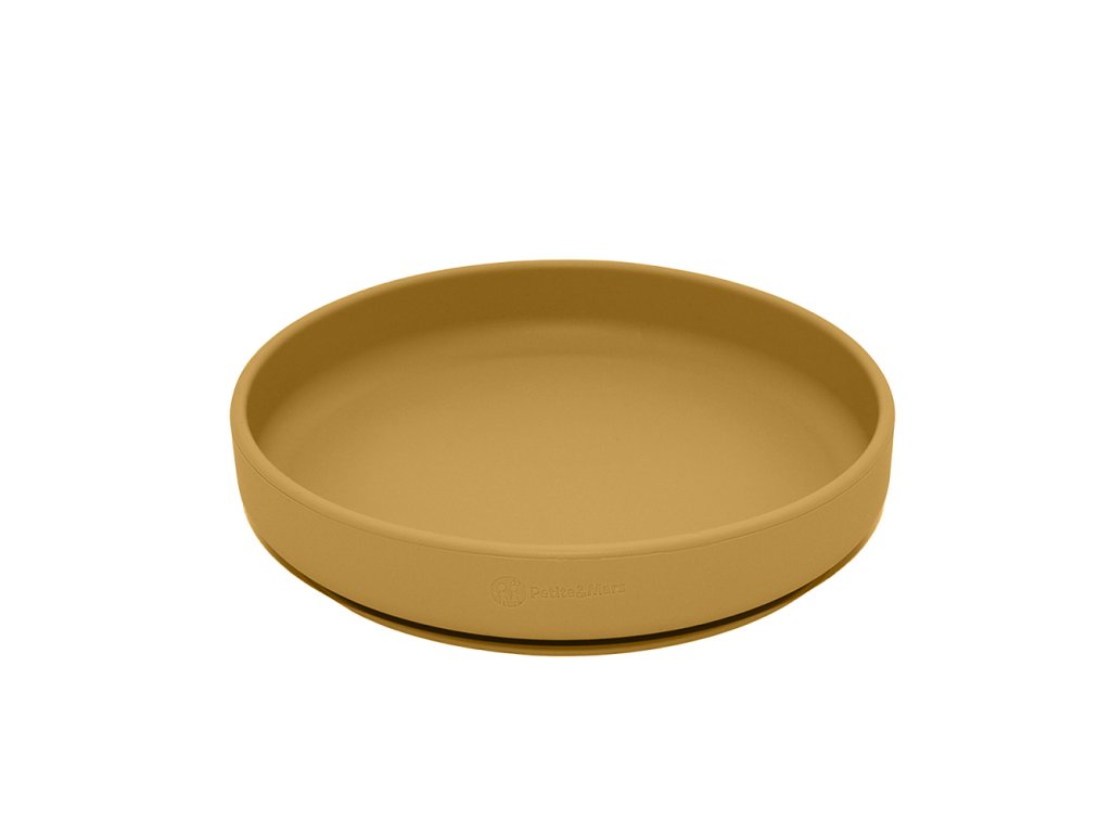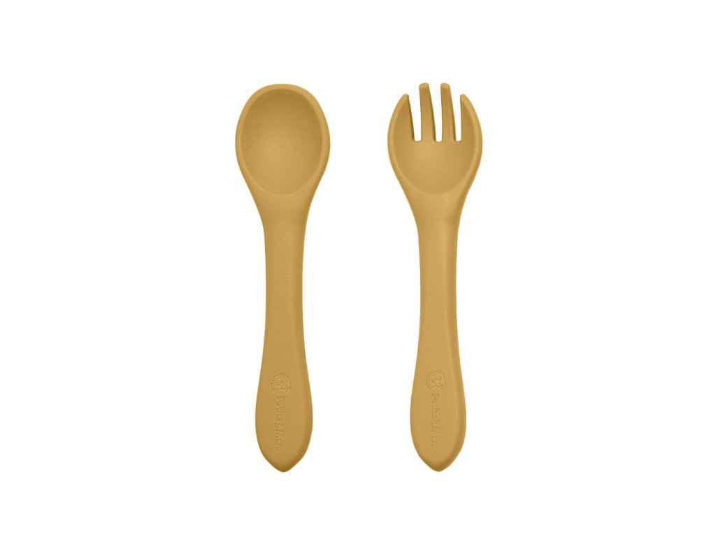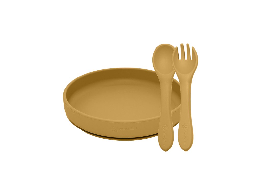 PETITE&MARS Set jídelní silikonový TAKE&MATCH 2 ks talíř + příbor Intense Ochre 6m+