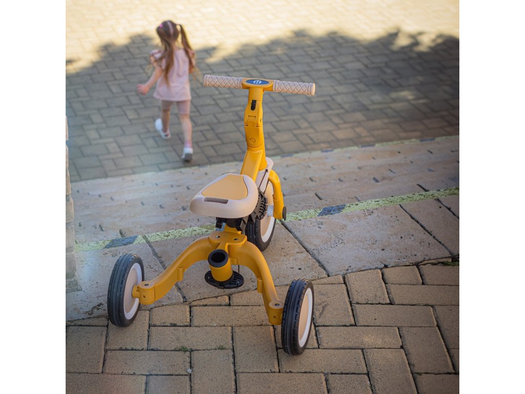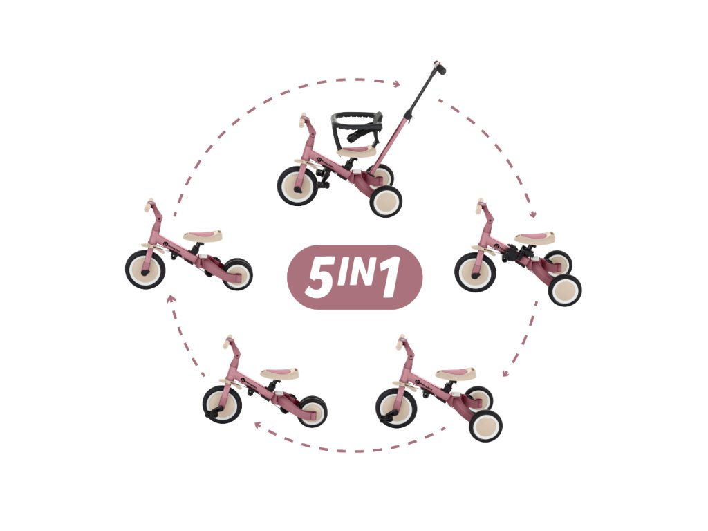 Multifunkční tříkolka určená pro děti od 1,5 do 5 let nebo do 25 kilogramů. Je to nejen dopravní prostředek pro přesun a učení se rovnováhy, ale také společník pro rostoucí dítě během mnoha vývojových fází. Promyšlené měnění se kola se přizpůsobuje potřebám děťátka podle toho, jak se vyvíjejí jeho motorické schopnosti. Zpočátku je to tříkolka s možností asistence rodiče, zatímco konečná verze je standardní kolo s pedály, bez jakýchkoli dalších podpůrných prvků. Díky takovým změnám můžete pomoci svému dítěti naučit se jezdit na dvou kolech.