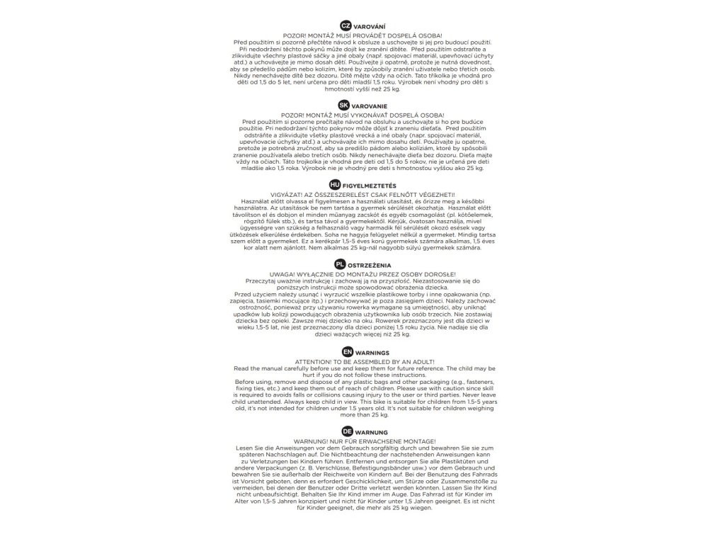 UPOZORNĚNÍ! Montáž musí provádět dospělá osoba! Před použitím si pozorně přečtěte návod k obsluze a uschovejte si jej pro budoucí použití. Při nedodržení těchto pokynů může dojít ke zranění dítěte. Před použitím odstraňte a zlikvidujte všechny plastové sáčky a obaly a uchovávejte je mimo dosah dětí. Používejte produkt opatrně, protože je potřebná dovednost, aby se předešlo pádům nebo kolizím, které by způsobily zranění uživatele nebo třetích osob. Nikdy nenechávejte dítě bez dozoru. Dítě mějte vždy na očích. Tato tříkolka je vhodná pro děti od 1,5 do 5 let, není určena pro děti mladší 1,5 roku. Výrobek není vhodný pro děti s hmotností vyšší než 25 kg.