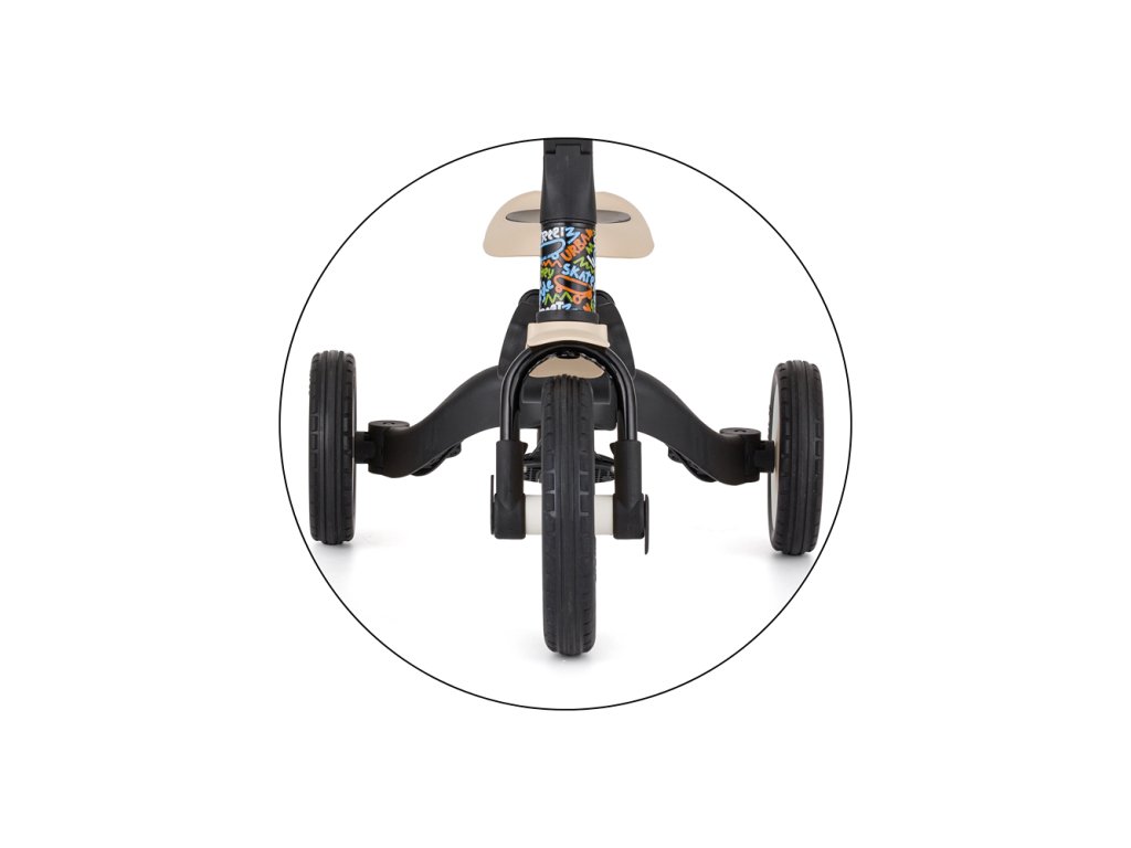 Multifunkční tříkolka je určena pro děti od 1,5 do 5 let nebo do 25 kg. Není jen prostředkem pro přesun a učení rovnováhy, ale také společníkem pro rostoucí dítě během mnoha vývojových fází. Díky promyšlené transformaci se přizpůsobí aktuálním motorickým schopnostem dítěte – od tříkolky s asistencí rodiče až po plnohodnotné kolo s pedály.