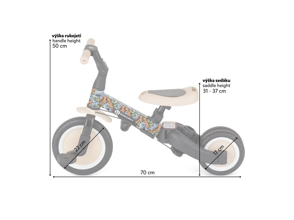 Rozměry: délka 67 cm, šířka 46 cm (tříkolová verze), výška sedla 31–37 cm