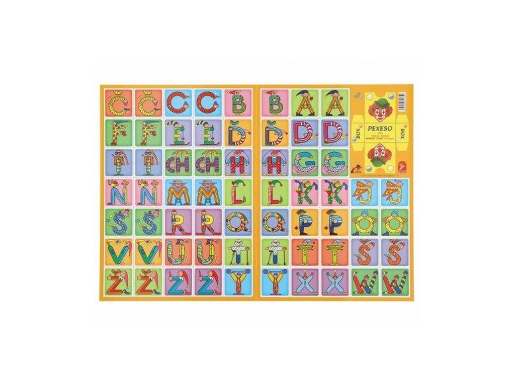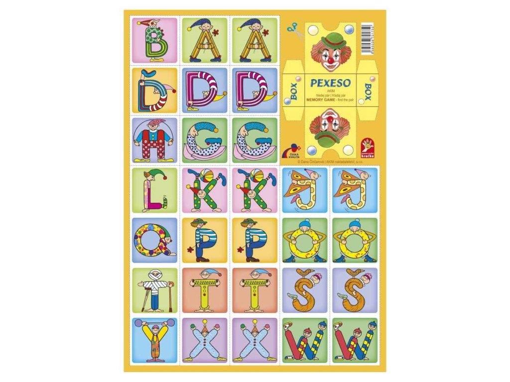 Klasické zábané pexeso s písmenky. Je z pevného kartonu s lesklou vodoodpudivou povrchovou úpravou. Na titulní straně je umístěn box k vystřižení pro možnost vložení vystřižených kartiček, aby se Vám nepoztráceli.