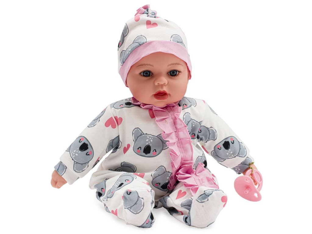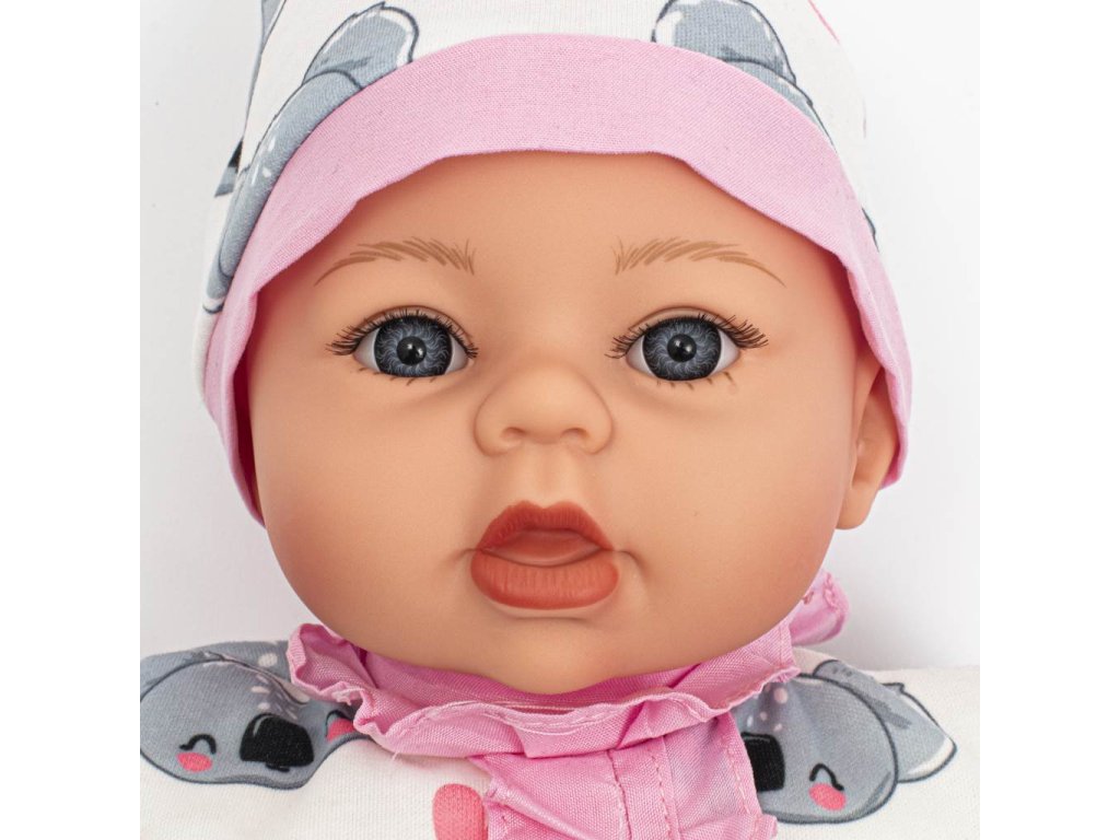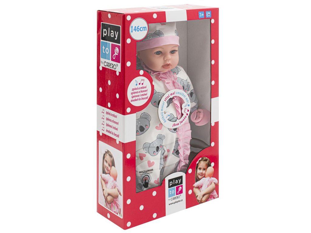 Krásná dětská panenka PlayTo. Skvělá hračka pro každou holčičku, která bude mít svoje mluvící miminko. Hlava, ruce a nohy jsou vyrobeny z gumy, tělíčko pak z měkkého materiálu, díky čemuž se může dítě k panence krásně přitulit. Panenka má dudlík. Panenka má milou tvářičku, která vypadá jak opravdové miminko a získá si srdce holčičky svými modrými kukadly a růžovými rtíky. Má roztomilé oblečení a čepičku. Oblečení lze sundat a vyprat. Délka panenky je 46 cm, je zabalená v barevné krabici a hodí se jako milý dáreček. Panenka má modul, který mluví 4 jazyky: polsky, česky, slovensky a maďarsky.Modul po stisknutí přehrává 5 písní a mluví 14 českých vět.